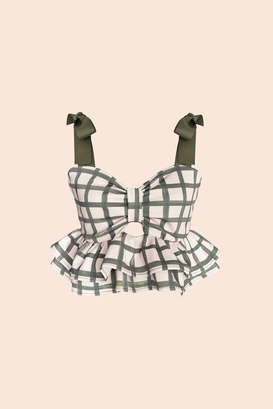 El diseño es inconfundiblemente coqueto, con tirantes anchos que se anudan delicadamente en los hombros con lazos en un tono verde sólido, añadiendo un contraste elegante. El centro del top está dominado por un llamativo lazo gigante, que no solo es un elemento decorativo clave, sino que también crea un sutil recorte en la parte inferior del busto, aportando un toque atrevido y moderno.