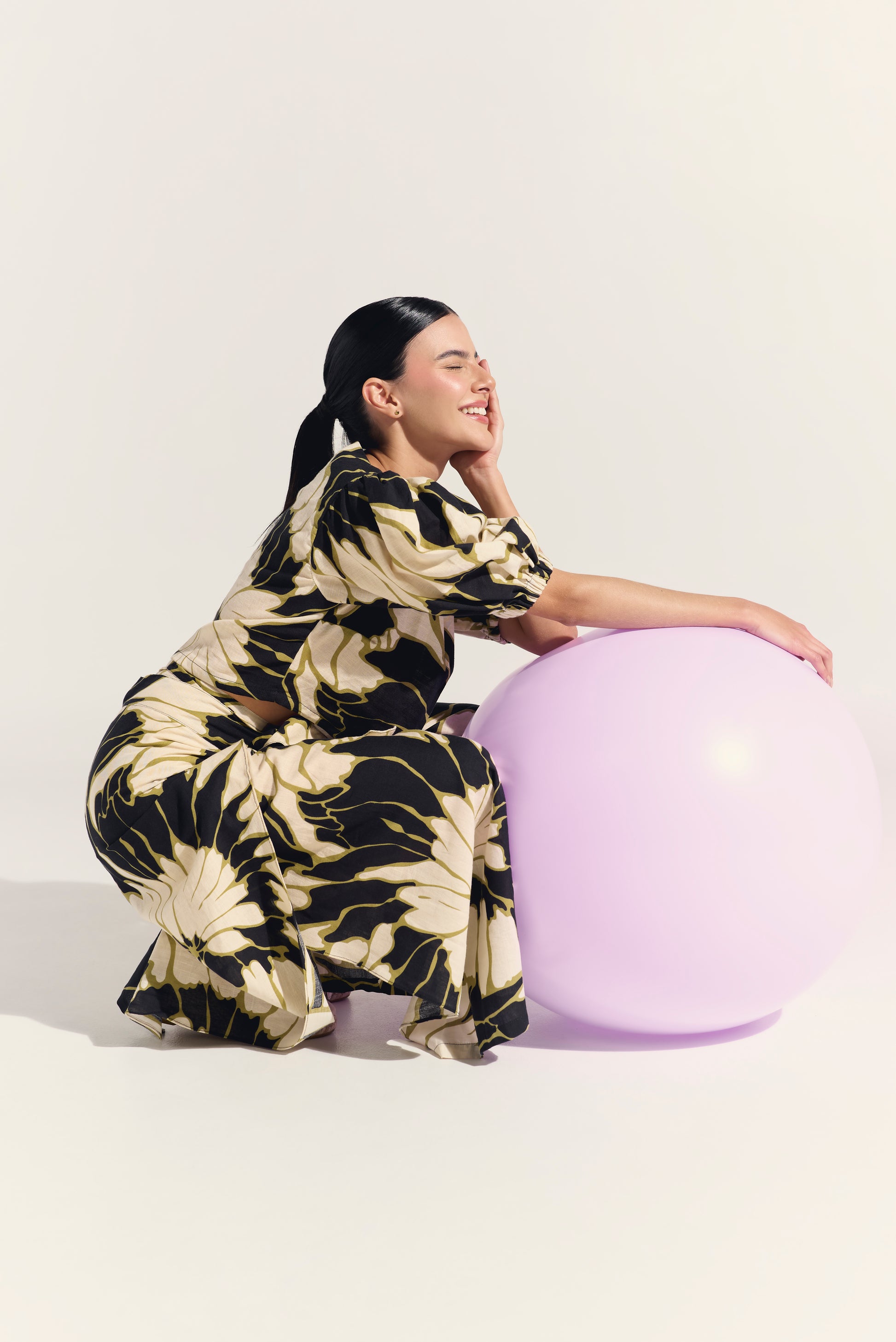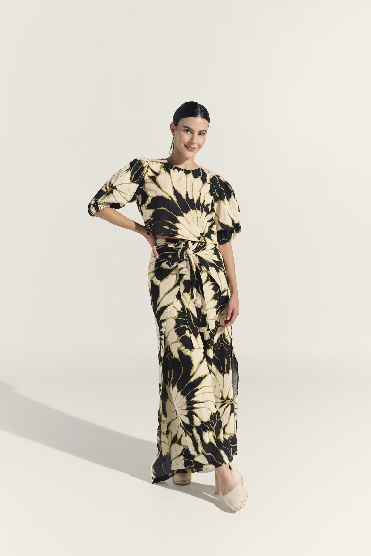 Complementando la blusa, el Pantalón Zarina, diseñado con un innovador concepto tipo falda/pañuelo, ofrece un ajuste cómodo en la cintura y una bota recta que fluye con elegancia. Su naturaleza multiusos lo convierte en la pieza ideal para combinar con básicos, trajes de baño o bodys, adaptándose a diversas ocasiones.