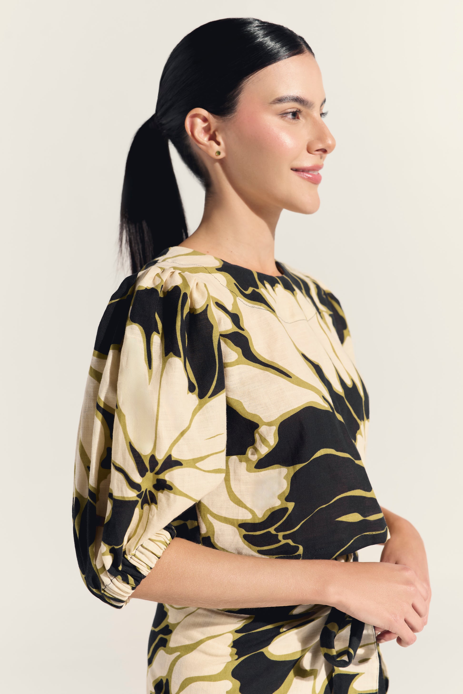 La Blusa Amaia destaca por su estampado de pétalos en tonos Ivory, verde militar y negro, creando un diseño llamativo y poderoso. Su cuello redondo y las mangas bombachas aportan volumen y una silueta segura y moderna.