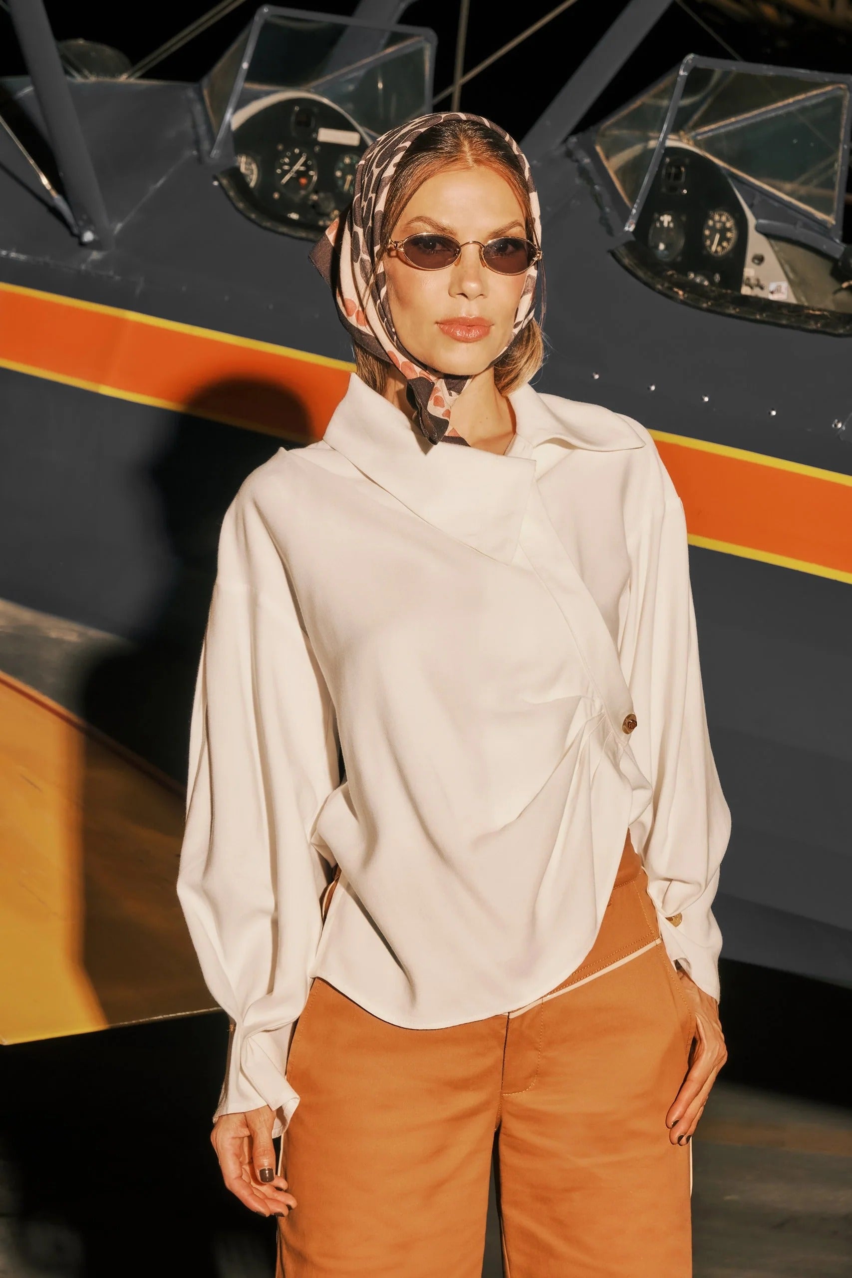La camisa amaral de silueta elegante con manga larga amplia, que se ajusta en el puño mediante botón, formando un delicado prense que aporta volumen y detalle. Presenta un drapeado sutil a la altura de la cintura, que estiliza y aporta movimiento. Cuenta con cartera de botonadura oculta para un acabado limpio, y una solapa de cuello amplia, que añade un toque sofisticado y contemporáneo. Ideal para looks formales con un giro moderno.