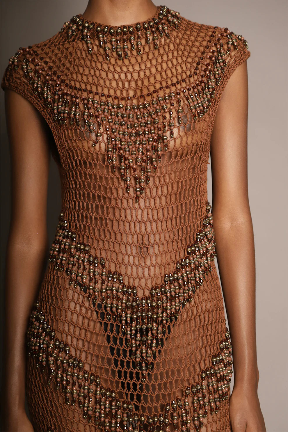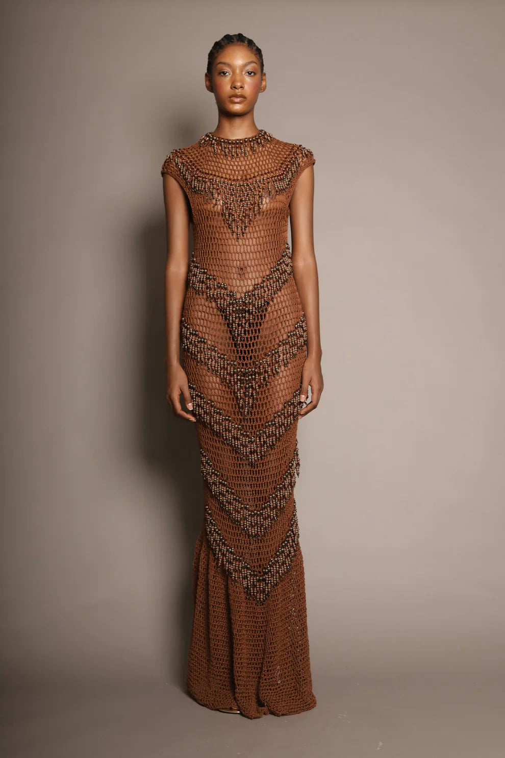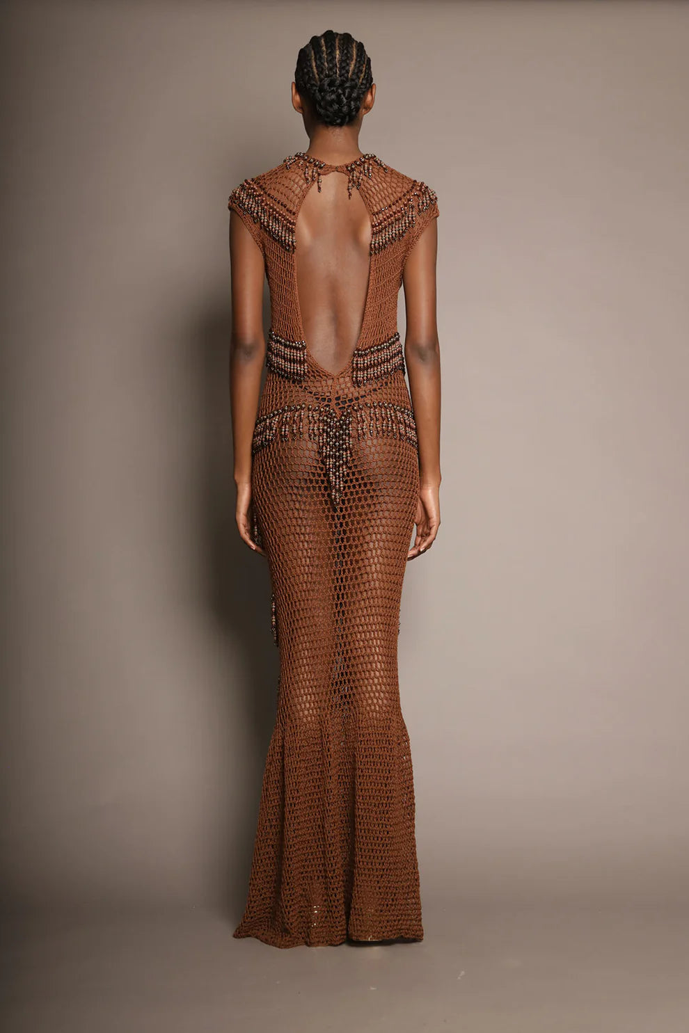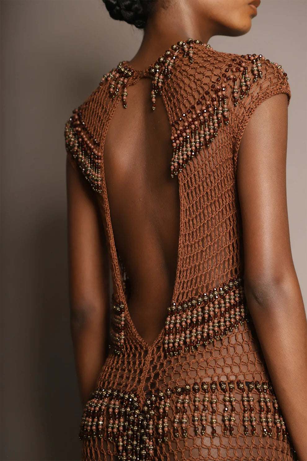 Esta pieza en crochet, adornada con canutillos bordados a mano en piedras ónix dispuestas en forma de V, presenta una silueta ajustada que realza la figura. Con mangas caídas y una espalda semidescubierta, combina elegancia con un toque de sofisticación artesanal, convirtiéndose en una opción única para cualquier ocasión especial.