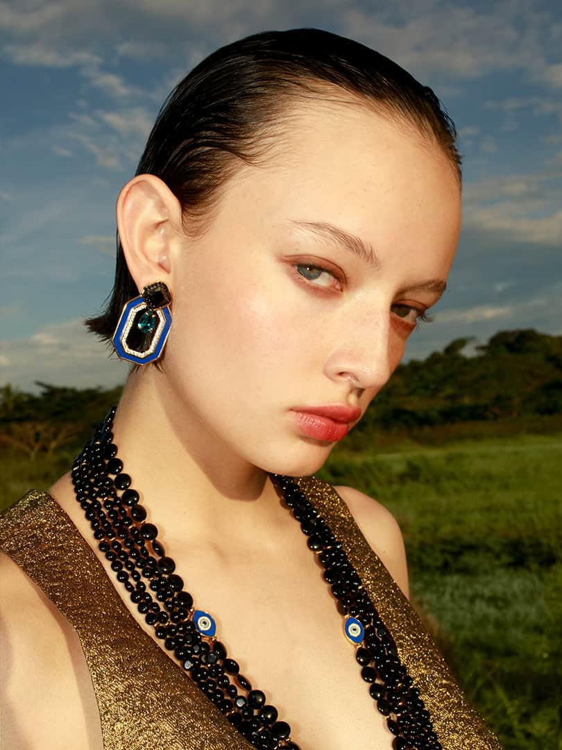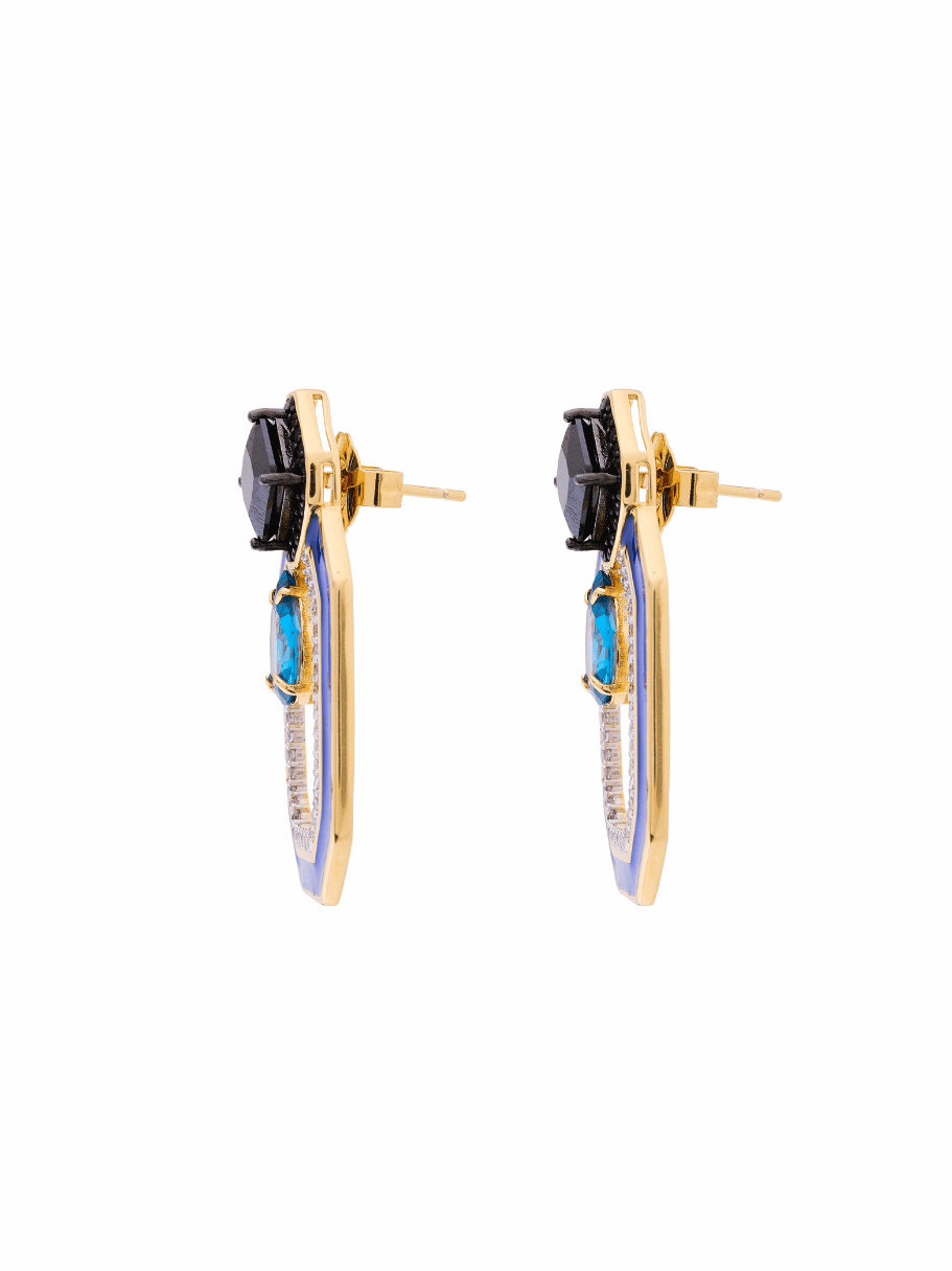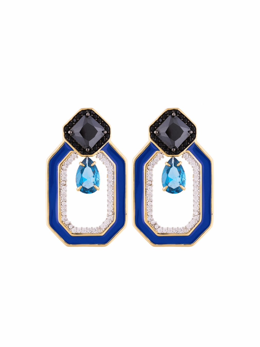 Elaborados en metal bronce con baño de oro de 18 kilates y baño de rodio blanco, adornados con cristales facetados en tonos negro y aqua enmarcados en un octágono irregular con incrustación de microcristales en tono cristal y esmaltado azul.