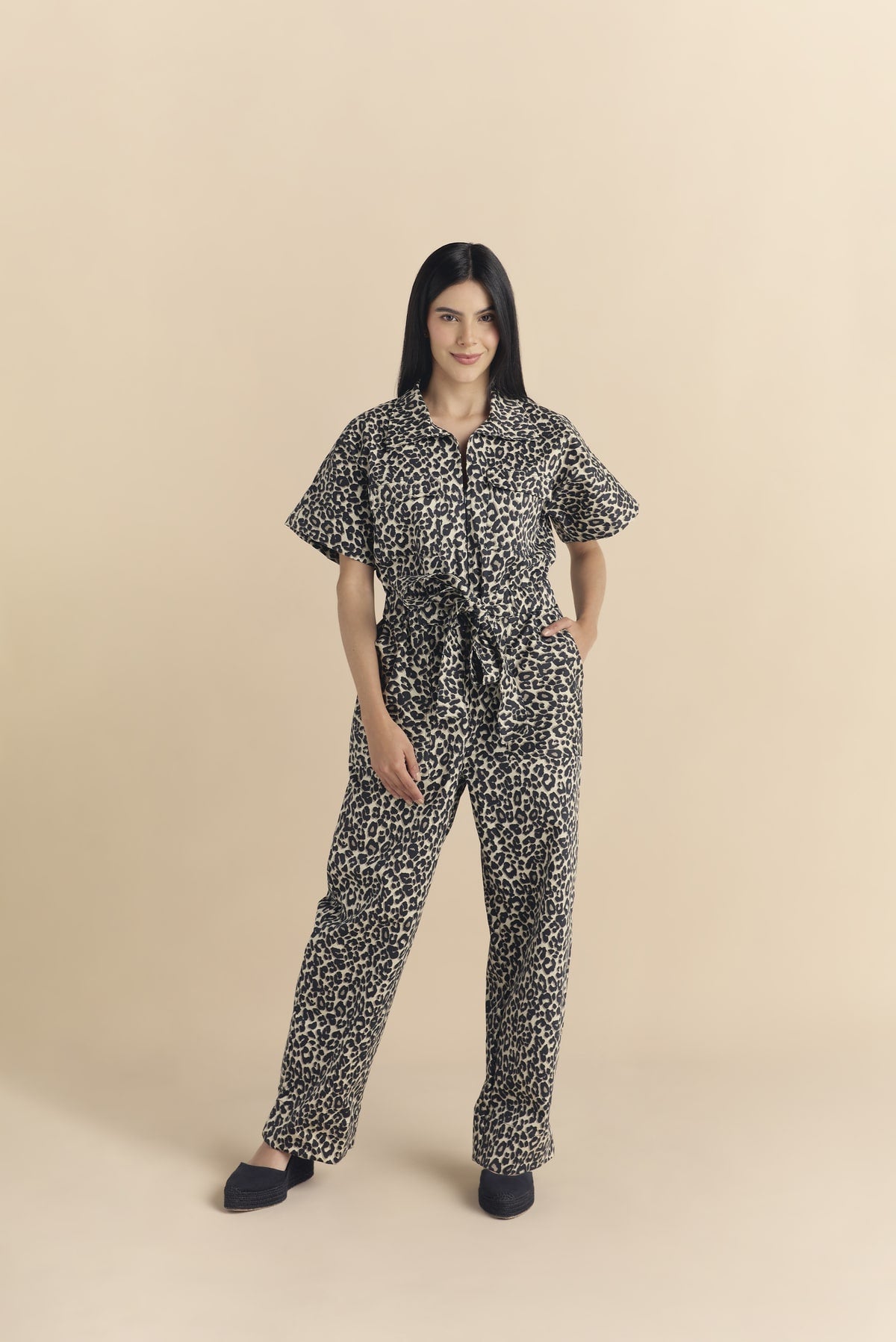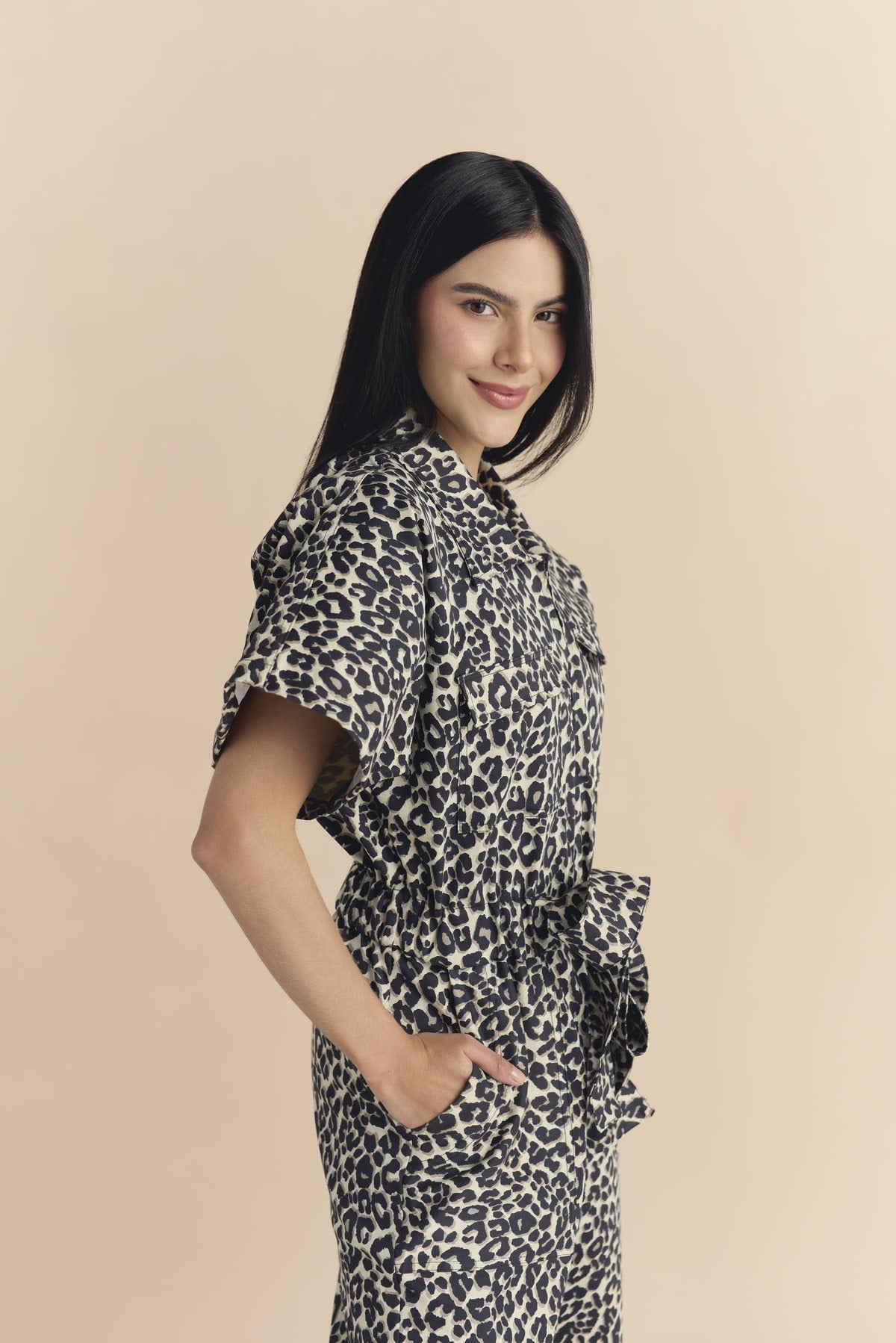 Con un audaz y sofisticado estampado animal en tonos tierra, el Enterizo Arisha no solo es llamativo, sino también increíblemente práctico. Incluye bolsillos tipo parche para mayor comodidad y un cinturón en la pretina que permite entallar y estilizar la figura, realzando la silueta de manera elegante.