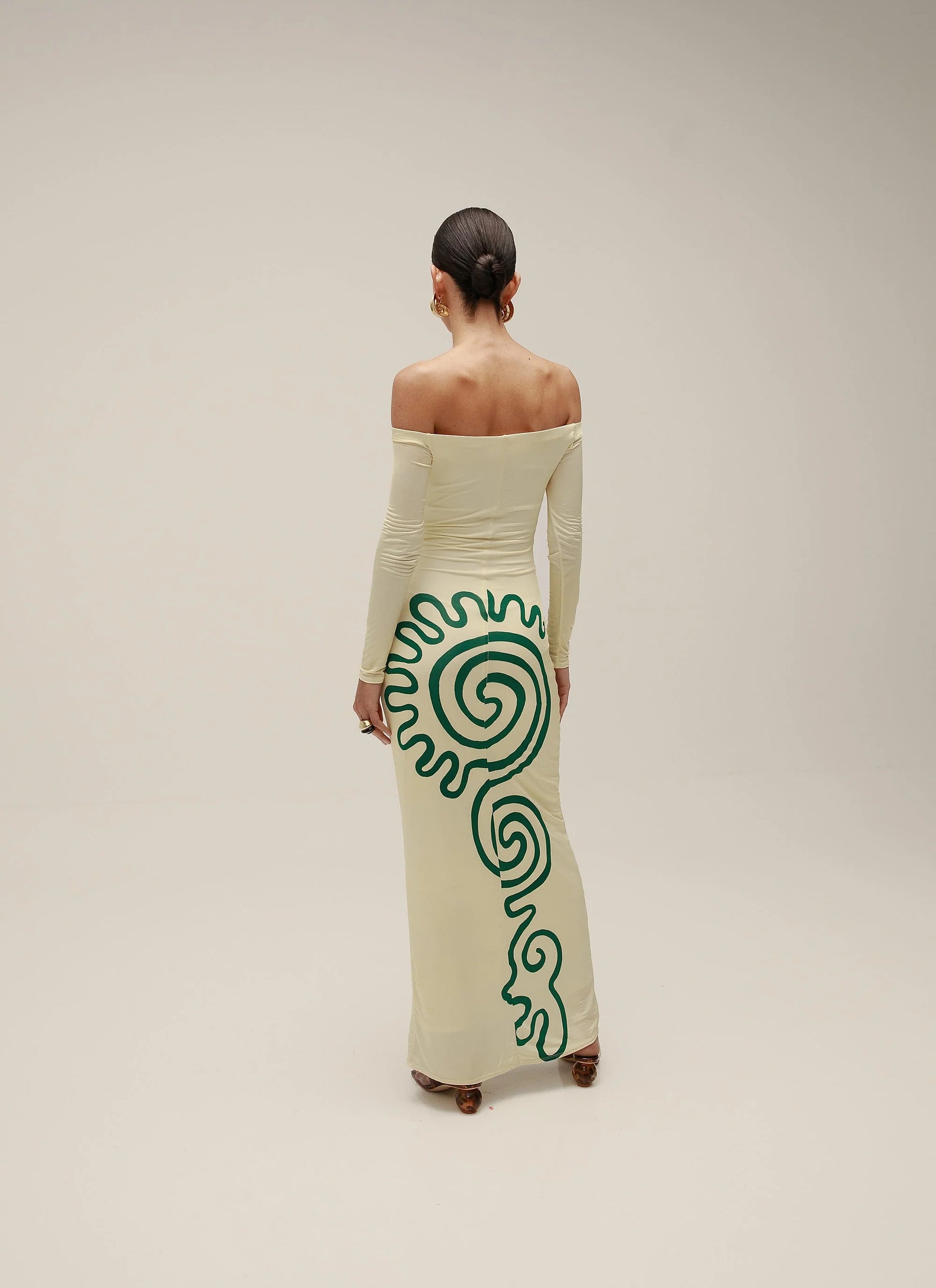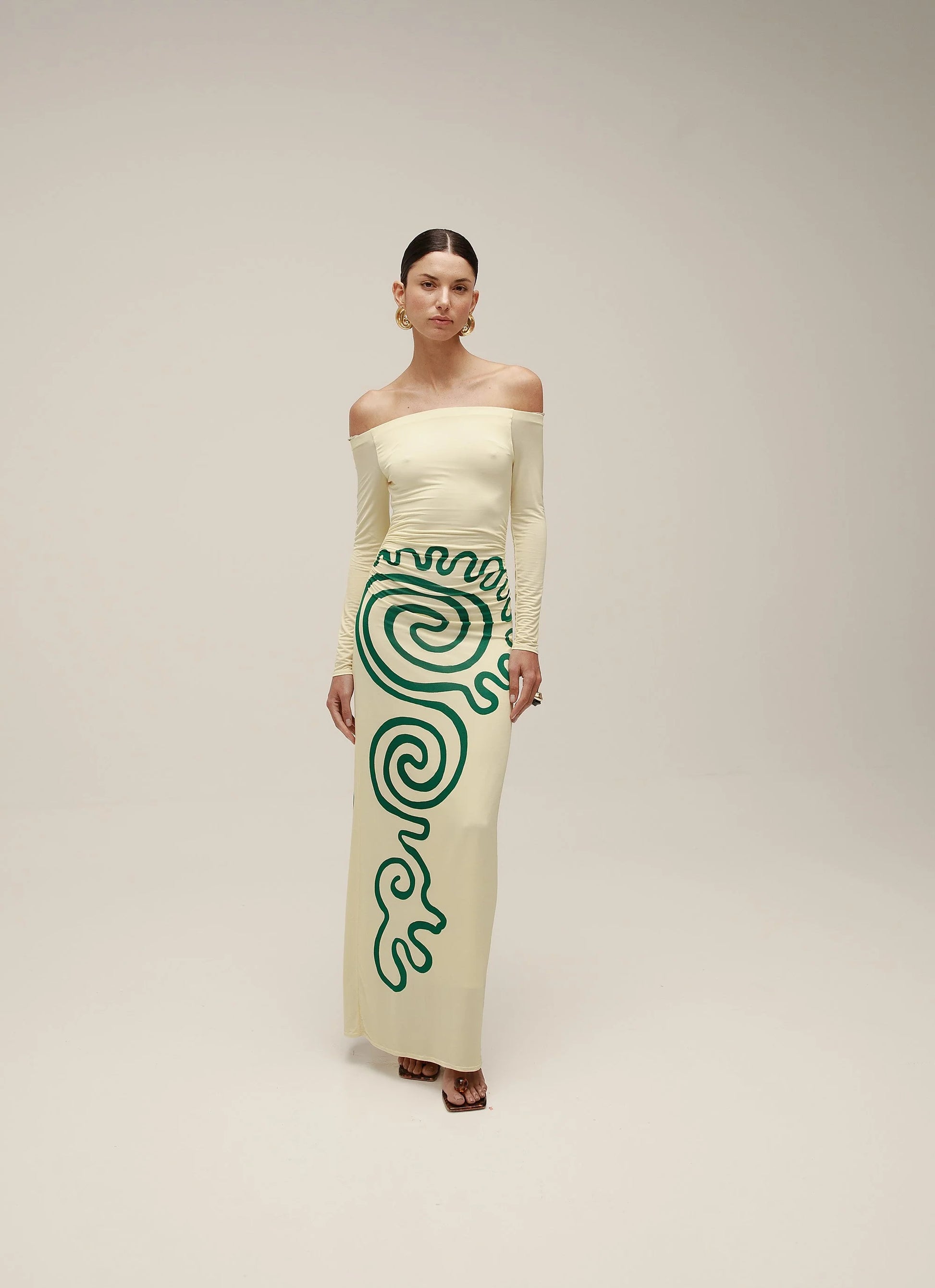 Vestido largo entallado, palabra de honor, manga larga y fruncido en