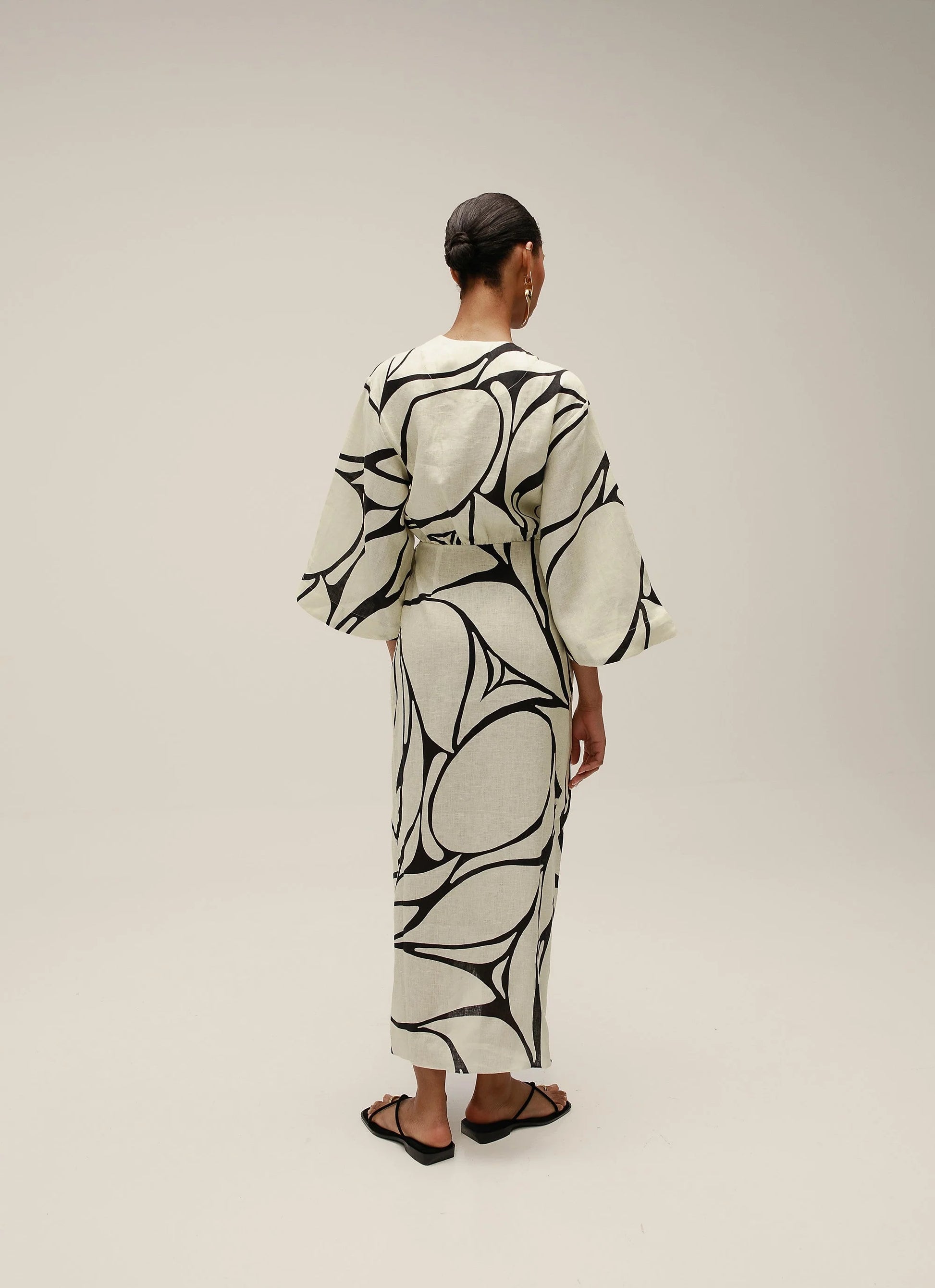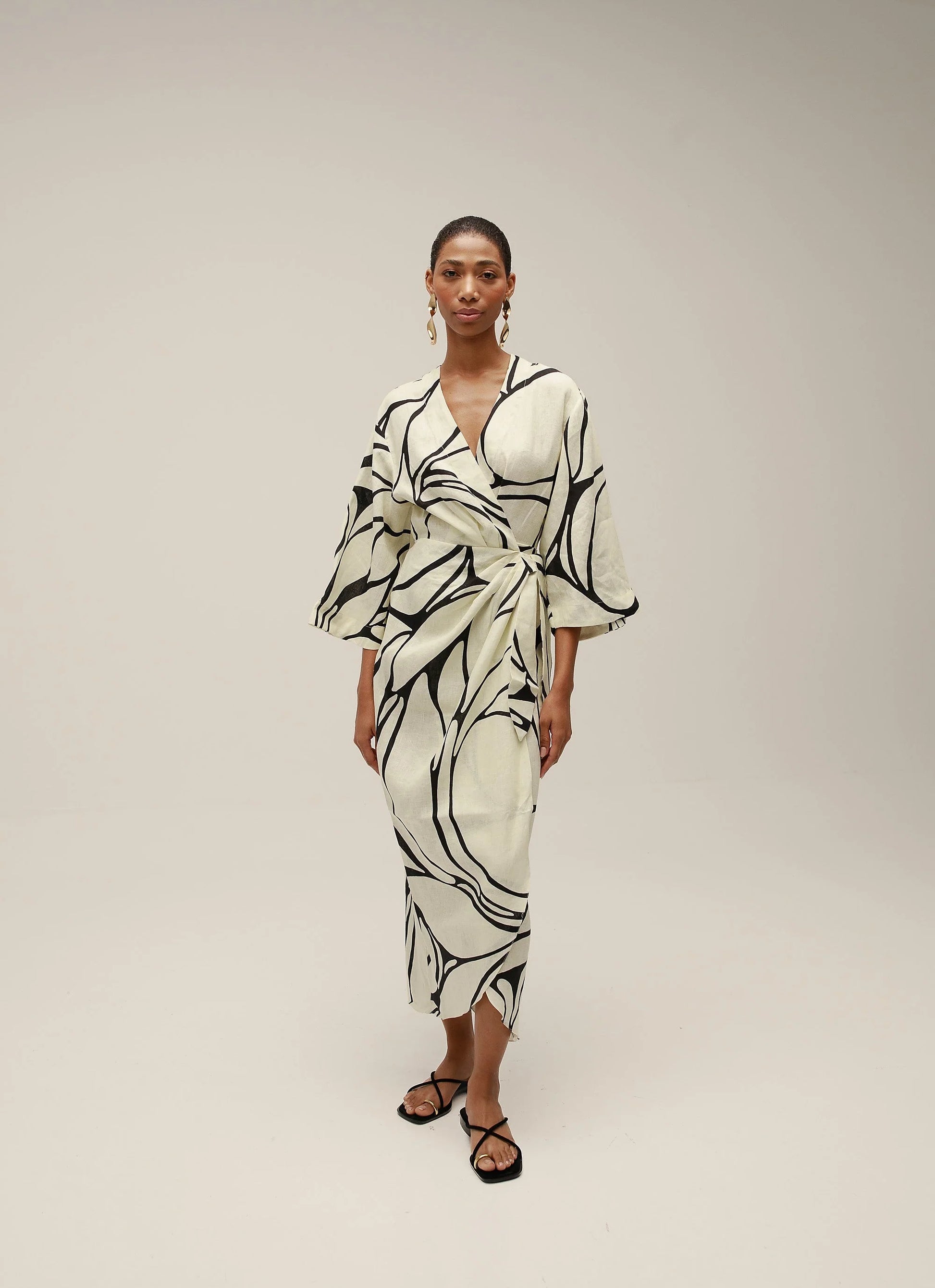 Vestido largo con falda cruzada, cuello en V profundo y mangas kimono