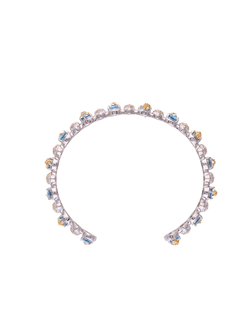 Elaborado en metal bronce con baño de oro de 18 kilates y rodio blanco, y adornado con cristales en tonos cristal y azul celeste, y técnicas de esmaltado en tonos blanco y azul claro.