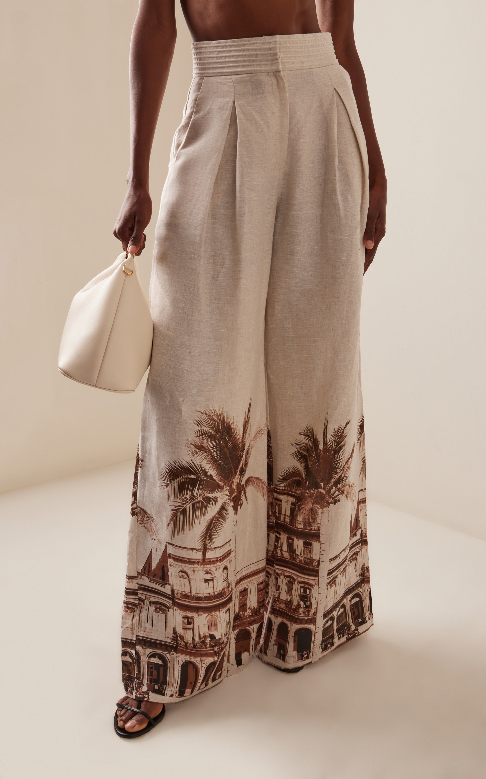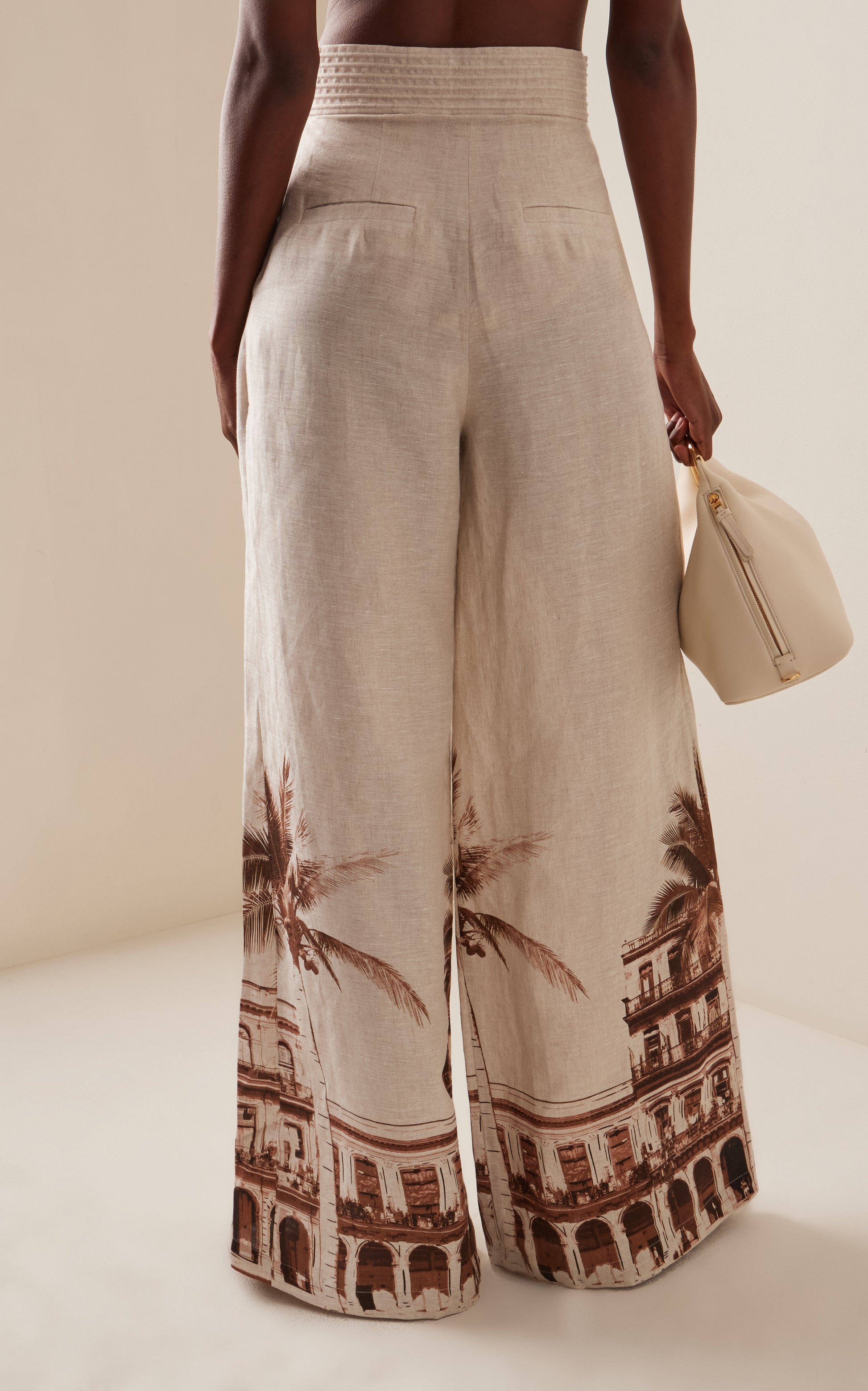 Confeccionados en lino fresco, los pantalones 'Chavitos' tienen una silueta de corte ancho y tiro ultra alto diseñada con pliegues favorecedores en la cintura y un estampado de un paisaje urbano con palmeras.