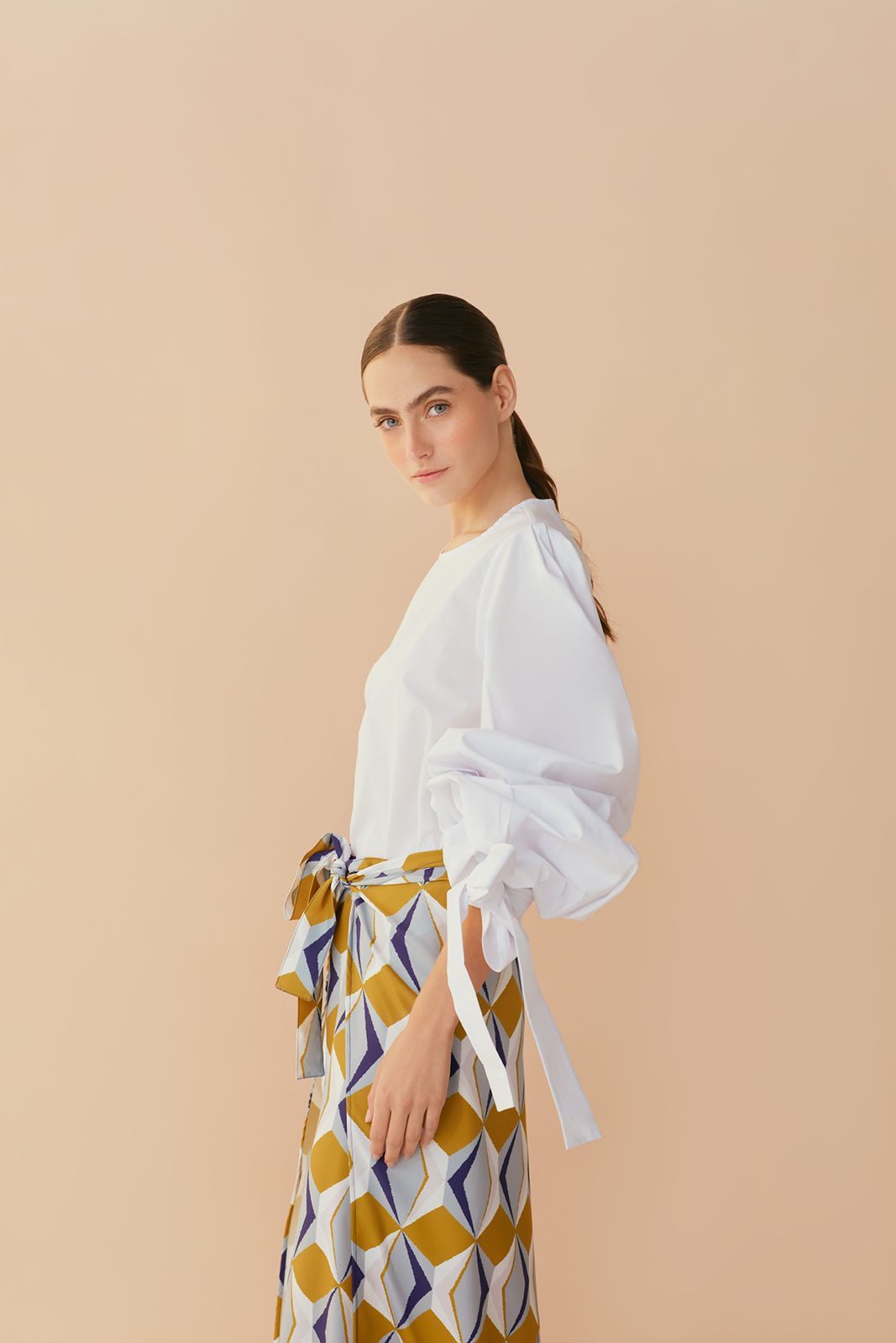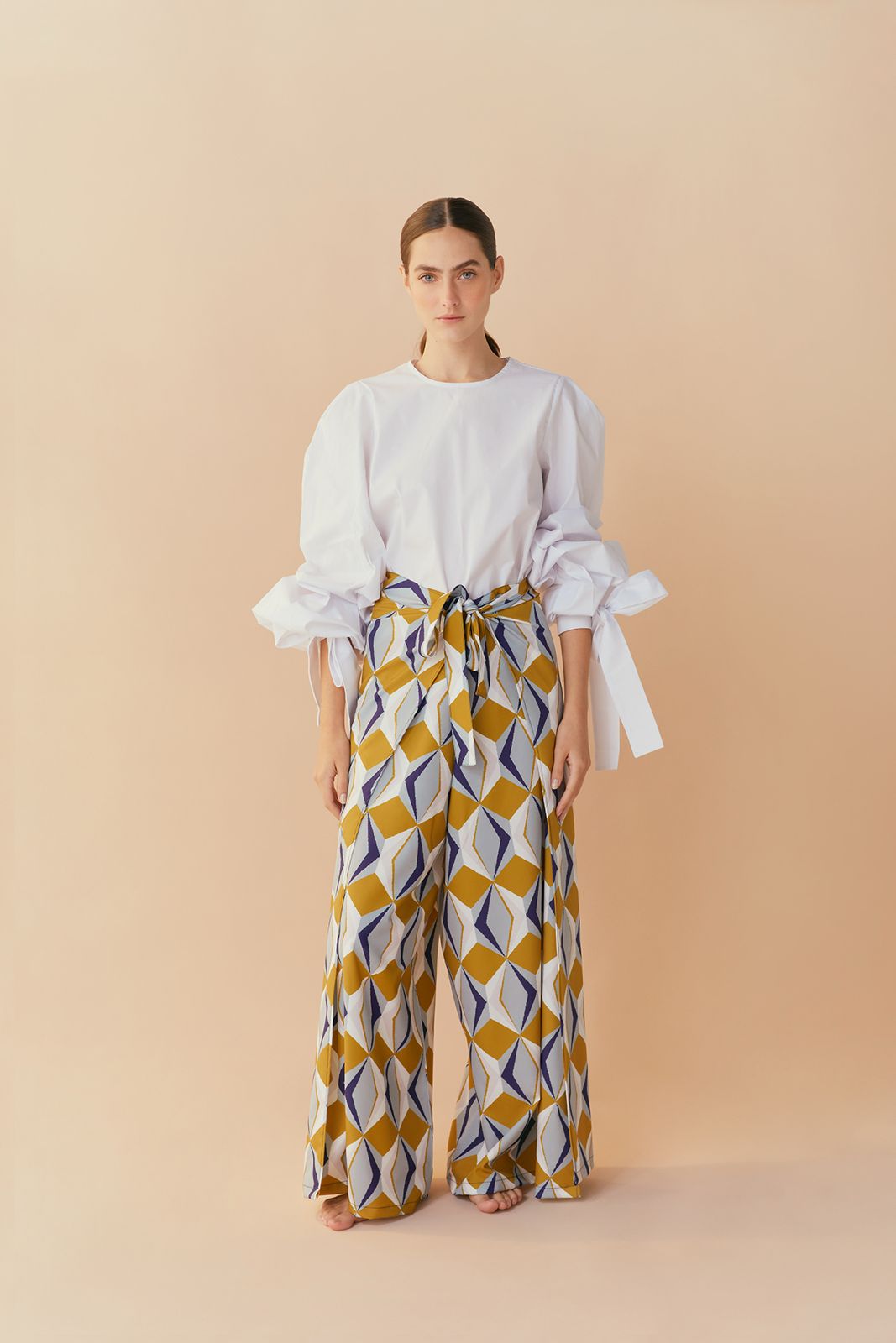 Complementando el top, el GIADA PANT es una pieza vibrante y audaz, adornada con un hipnótico estampado geométrico. El patrón combina rombos en tonos mostaza, azul petróleo, blanco y negro, creando un diseño dinámico y contemporáneo. Un cinturón anudado en la cintura no solo permite un ajuste perfecto, sino que también añade un detalle chic y pulido.