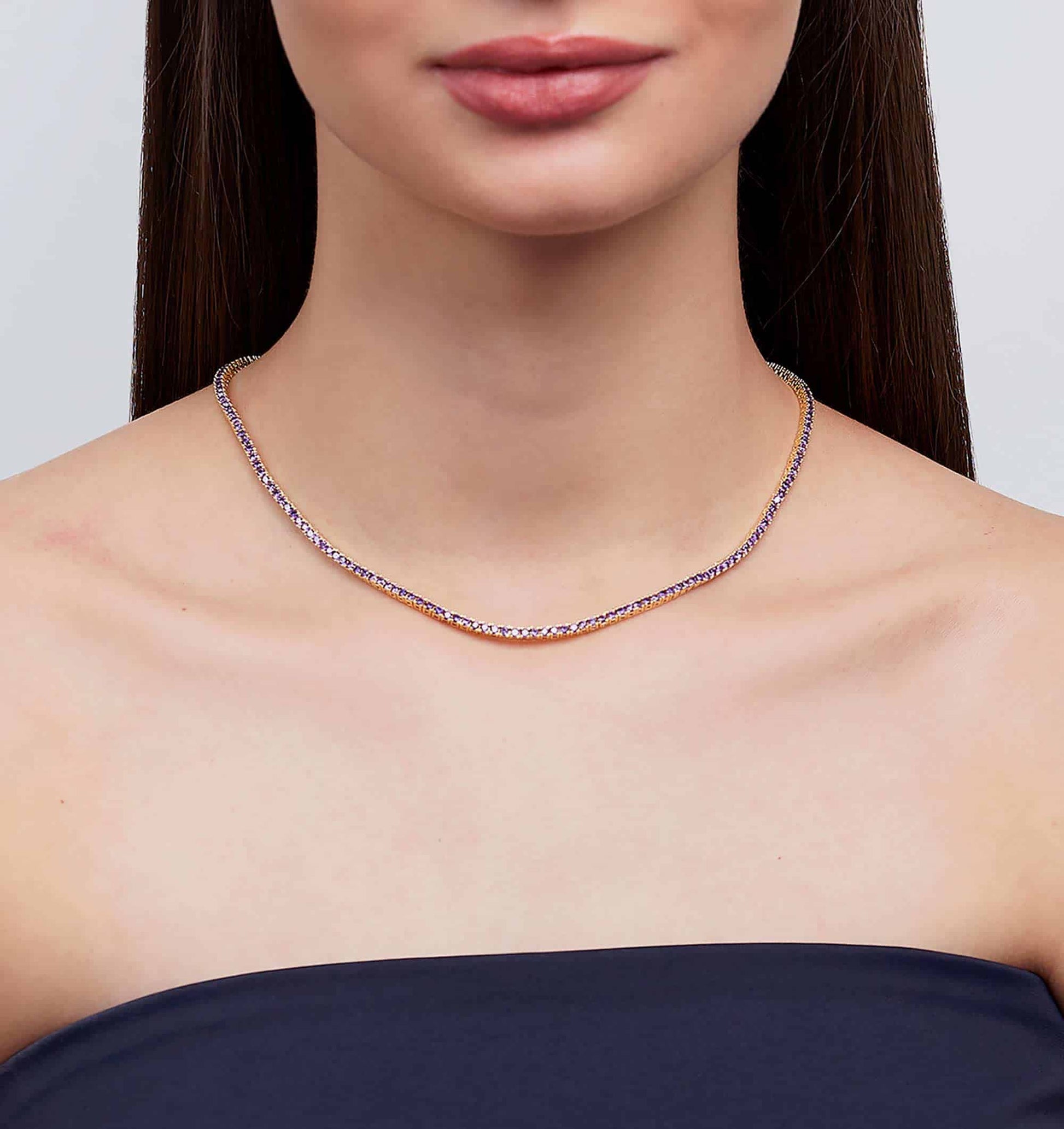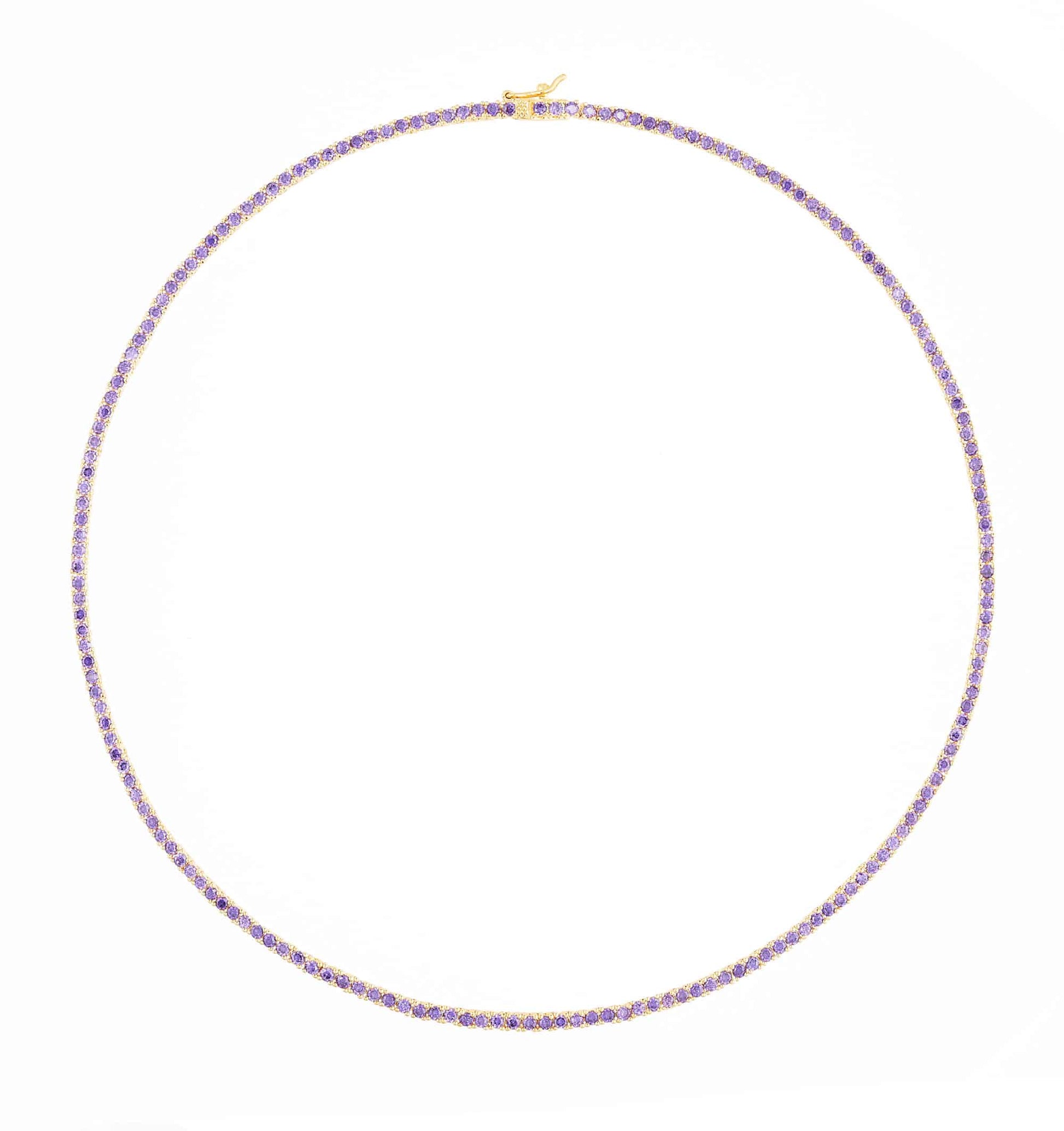 Cadena elaborada en bronce con baño de oro amarillo de 24k e incrustaciones de cristales color amatista.