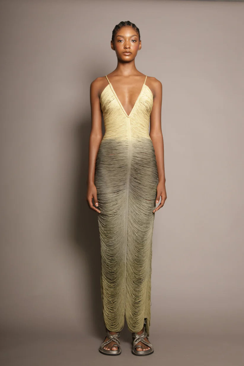 Con un profundo escote en V y tirantes ajustables, esta pieza realza la silueta con un toque de elegancia. La abertura en la falda posterior añade un movimiento sutil y fluido. Teñida artesanalmente, cada prenda presenta variaciones únicas que le confieren un carácter auténtico y distintivo.