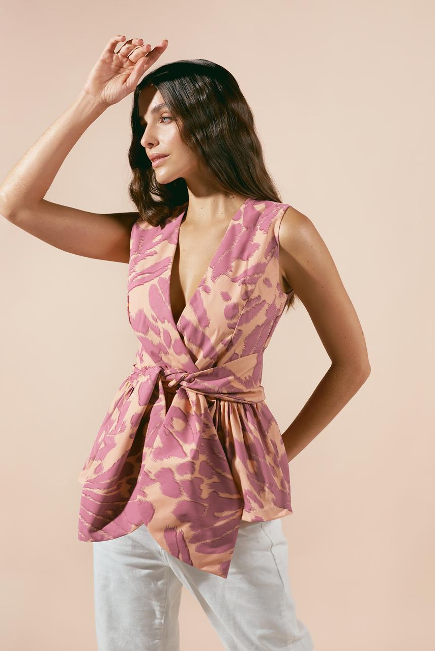 Su diseño presenta un favorecedor cuello en V profundo y sin mangas, que aporta frescura y elegancia. La blusa se distingue por un detalle de nudo frontal que entalla la cintura de forma sutil, realzando la silueta con un toque femenino. La parte inferior exhibe una caída asimétrica, añadiendo movimiento y un estilo único que la diferencia.