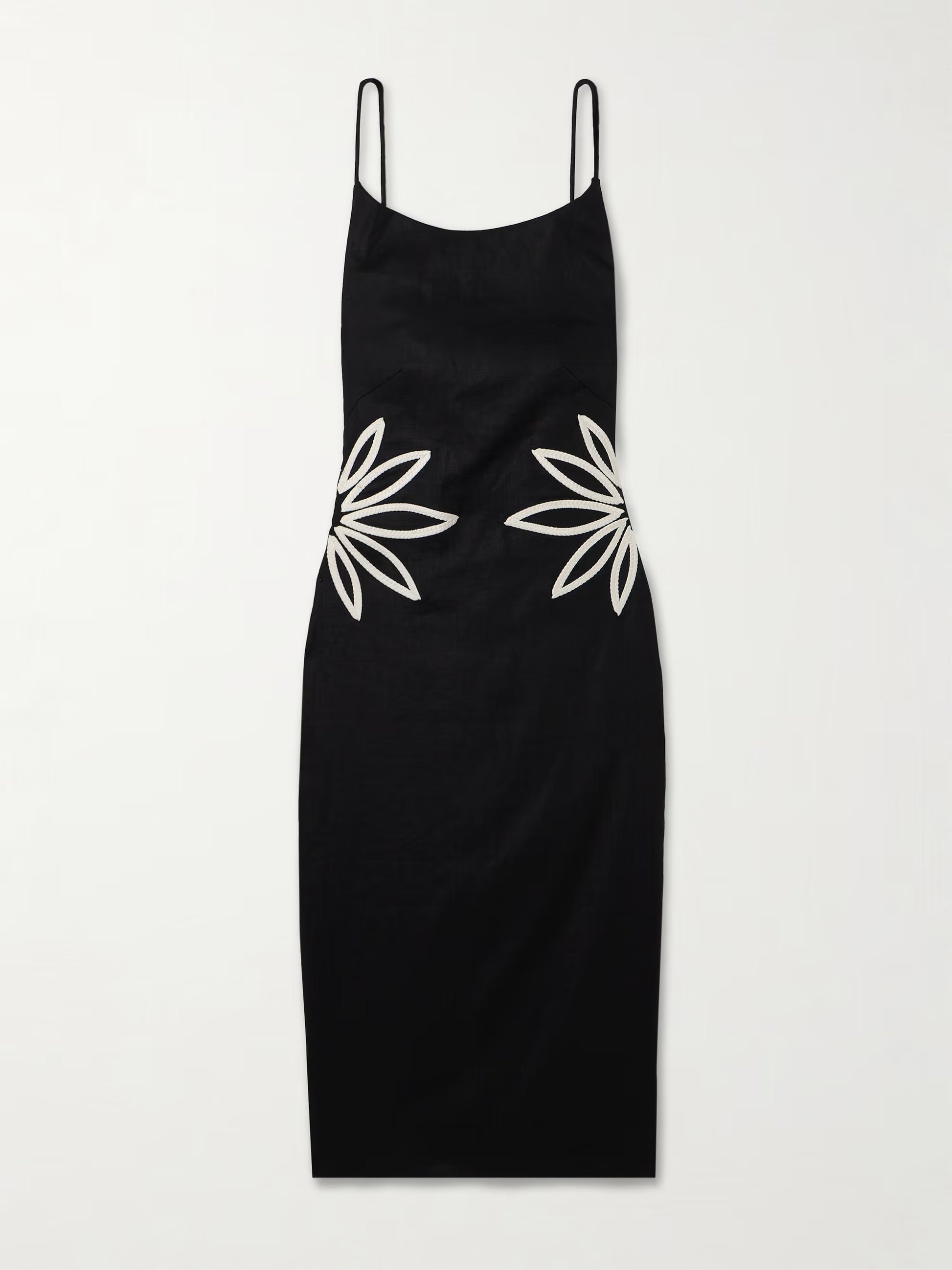 Este elegante vestido midi negro de tirantes finos es un ejemplo de sofisticación minimalista con un toque artístico. Su silueta entallada se ve realzada por los dos motivos florales estilizados en color blanco roto, estratégicamente colocados en los laterales de la cintura. Estos detalles, que simulan el contorno de grandes flores, añaden un contraste visual impactante y un aire contemporáneo al diseño clásico.