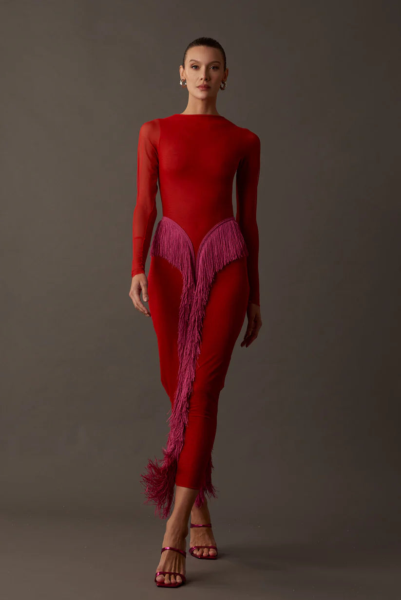 Nuestro vestido se convierte en una obra de arte al fusionar la suavidad y elasticidad de una tela en malla con la sensación delicada al tacto. Estas propiedades complementan la singularidad de los flecos que adornan tanto la parte posterior como la delantera, creando una poesía visual que trasciende las palabras.
