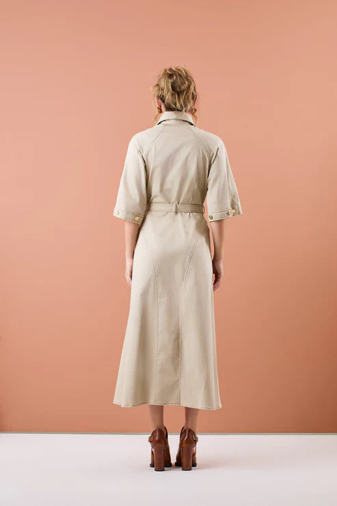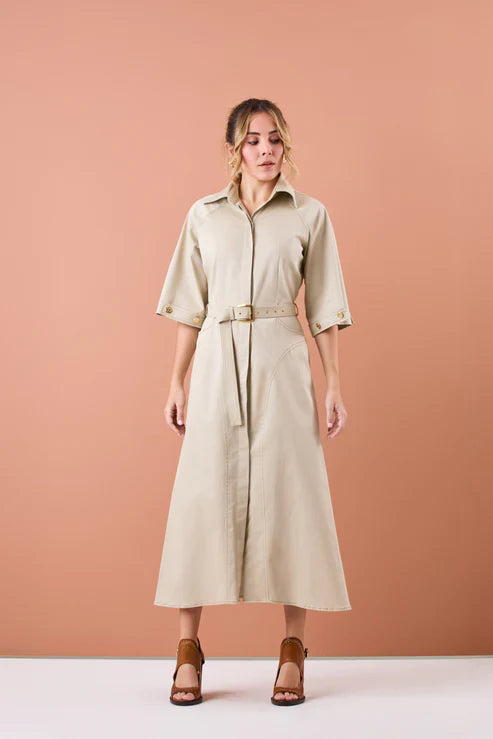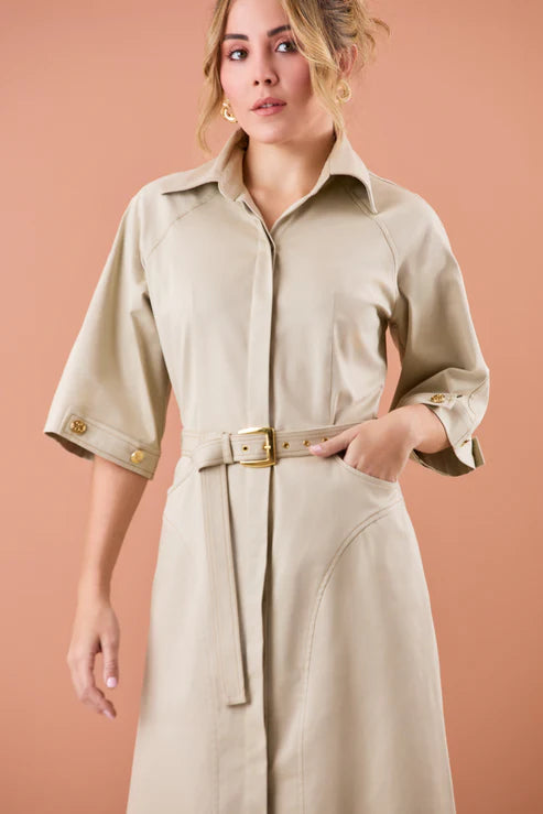 Este elegante vestido estilo gabardina presenta un cuello camisero estructurado y mangas tres cuartos con botones dorados. Un cinturón ceñido a la cintura le da una silueta favorecedora, mientras que las costuras limpias y angulares acentúan la figura femenina. Confeccionado en suave tela de algodón, este vestido combina a la perfección sofisticación y estilo práctico.