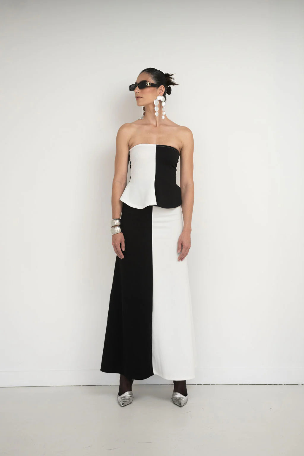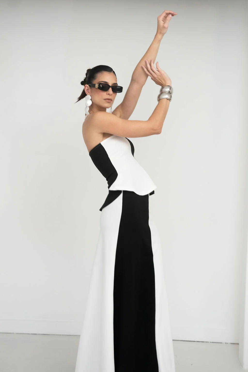 El top bustier sin tirantes combina de forma audaz el blanco y el negro, creando un contraste dinámico. Su silueta de peplum sutil define la cintura y añade un toque de sofisticación.