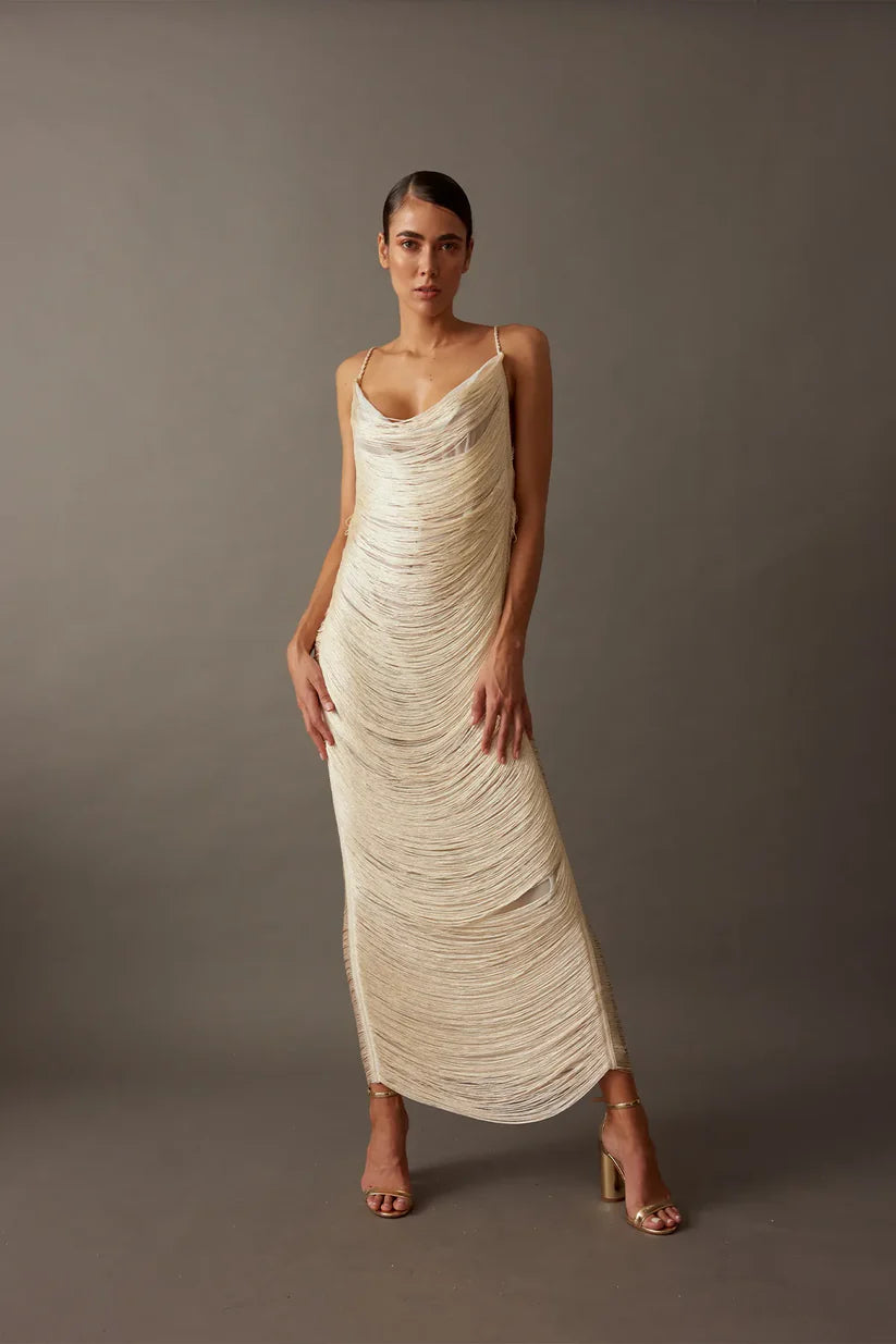 Te presentamos nuestra gema, una creación única con una longitud de 130 centímetros. Este espectacular vestido se caracteriza por la caída de sus hilos que envuelven tu silueta, se compone por un forro confeccionado en un tejido suave al tacto que te envuelve en una sensación de comodidad y elegancia.