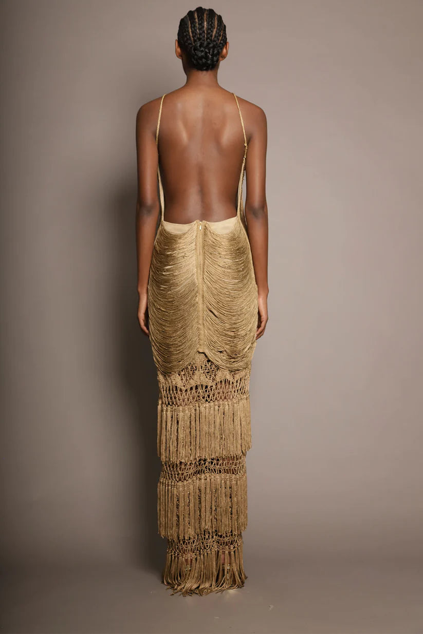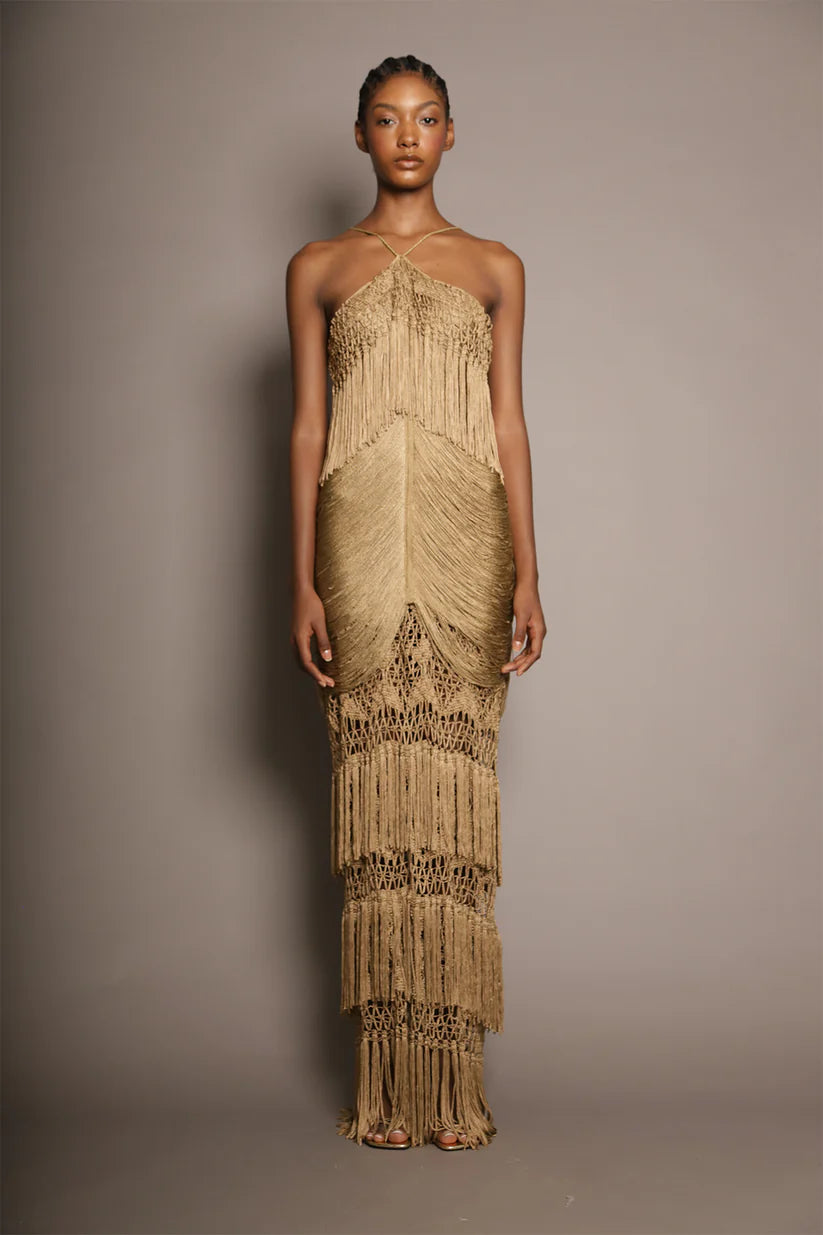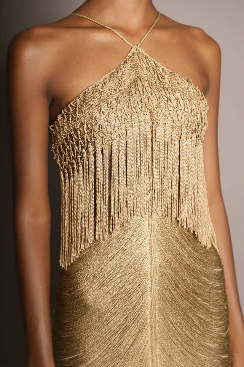 Esta pieza combina elegancia y originalidad. Con un elegante cuello halter y una espalda descubierta, su diseño destaca por los flecos que caen en delicadas direcciones verticales y horizontales. La falda, tejida en malla, aporta un toque único y artesanal, convirtiendo cada movimiento en una expresión de estilo y distinción.