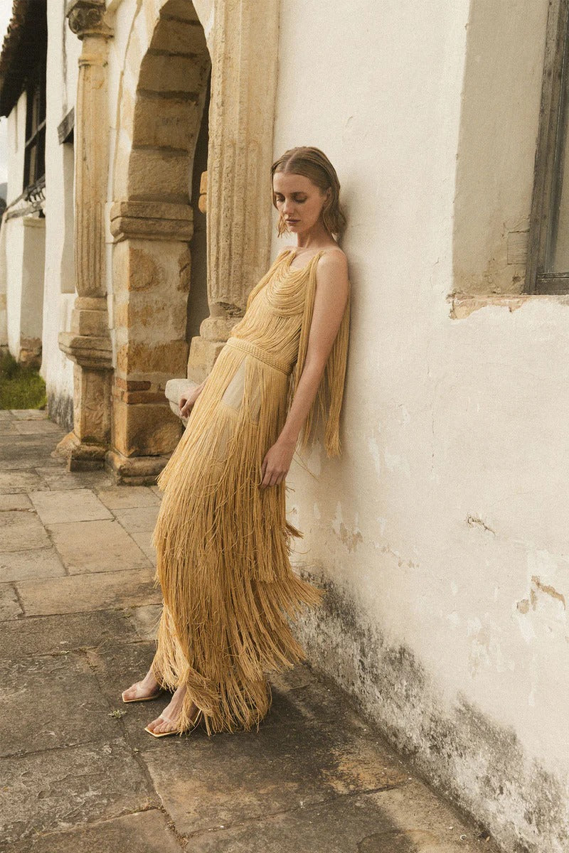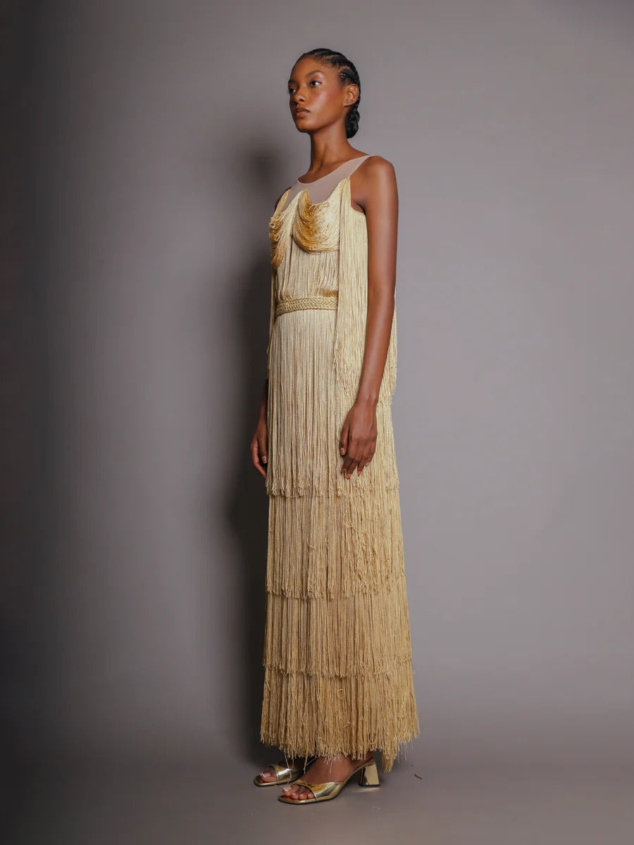 Vestido largo que llega justo por debajo de los tobillos, con escote redondo y hombros de malla translúcida. Presenta flecos drapeados sobre el pecho y la espalda, con hilos que caen delicadamente a los lados. La cintura se ciñe con un cinturón tejido que realza la figura, y la falda se distingue por cuatro capas de flecos que le aportan un elegante movimiento.