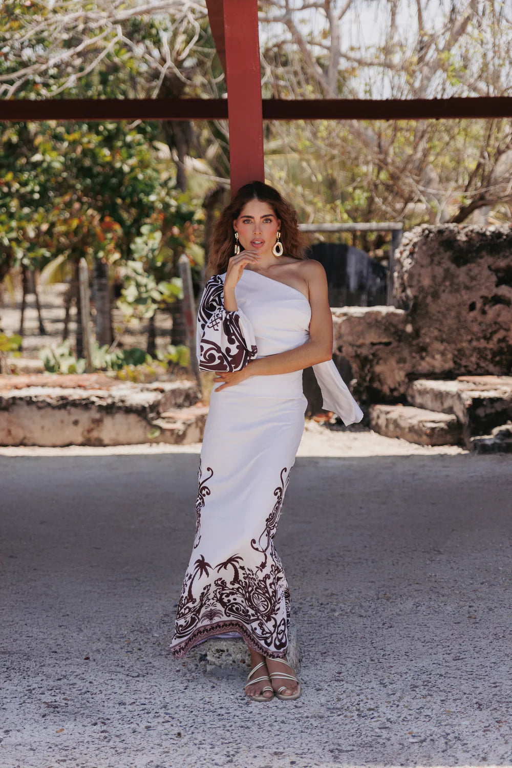 Elegante set de alta costura está confeccionado en crépe georgette, una tela ligera con una caída fluida que realza cada movimiento. Diseñado con un corte asimétrico de un solo hombro, el top destaca por su silueta estructurada y sofisticada. La manga abullonada, intervenida con un estampado ornamental en tono vino profundo, añade un toque artístico y dramático que equilibra perfectamente la limpieza del resto de la prenda.