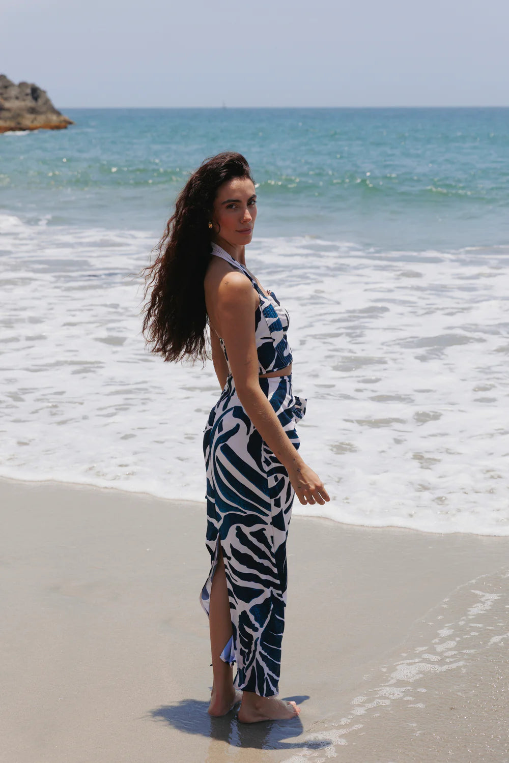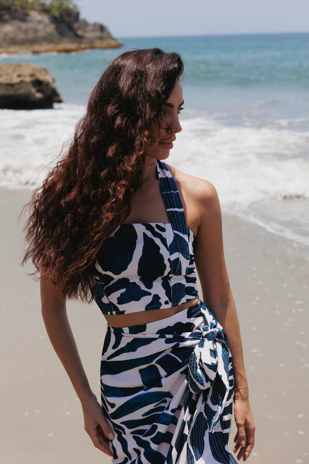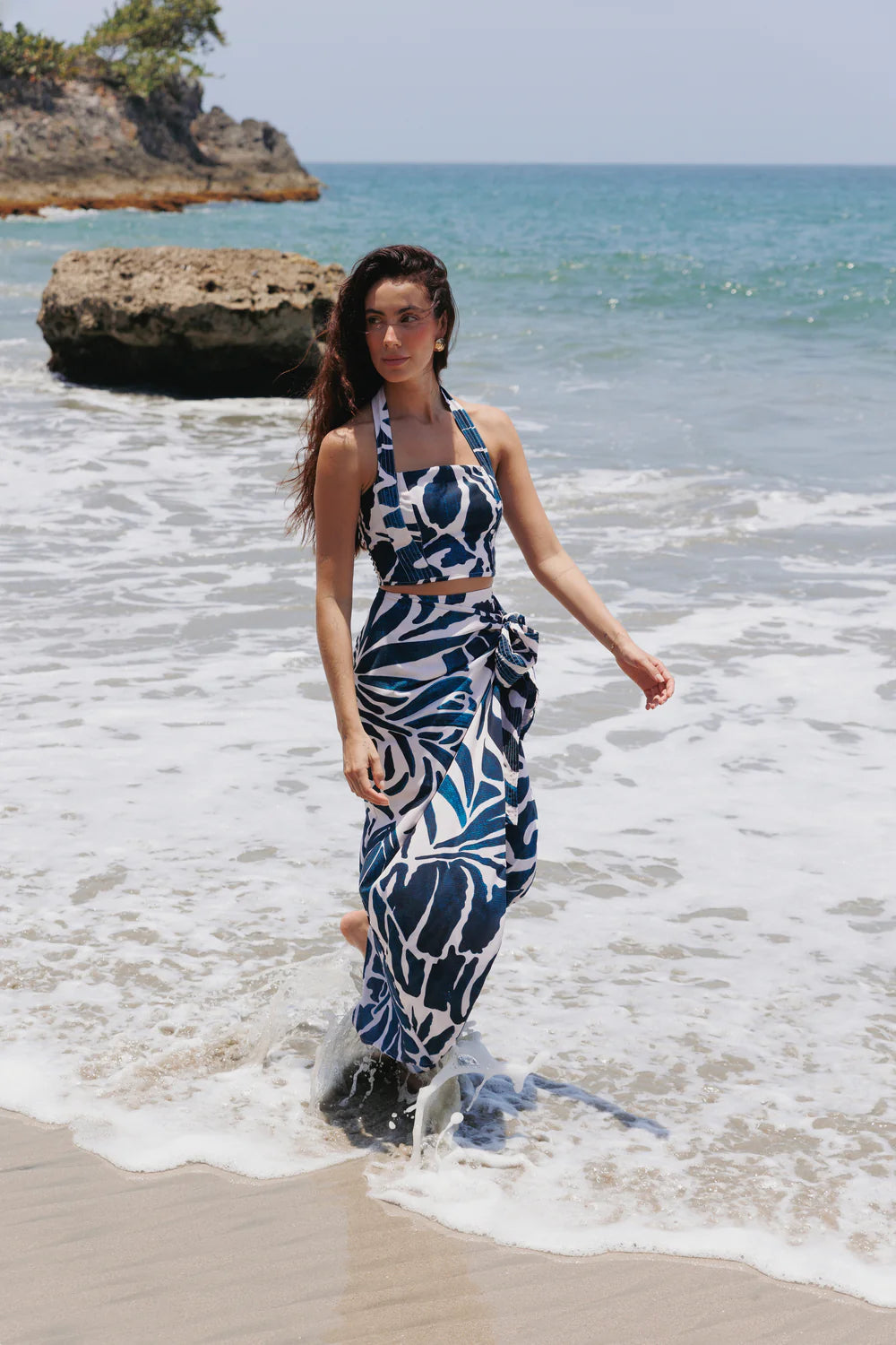 Top de corte halter presenta una estructura firme y un escote recto que resalta los hombros. El pespunte blanco, visible desde la base del busto hasta las tiras que se anudan en la parte posterior del cuello, crea un contraste sutil pero impactante sobre el estampado botánico en tonos azul marino. Una pieza ideal para destacar con elegancia bajo el sol.