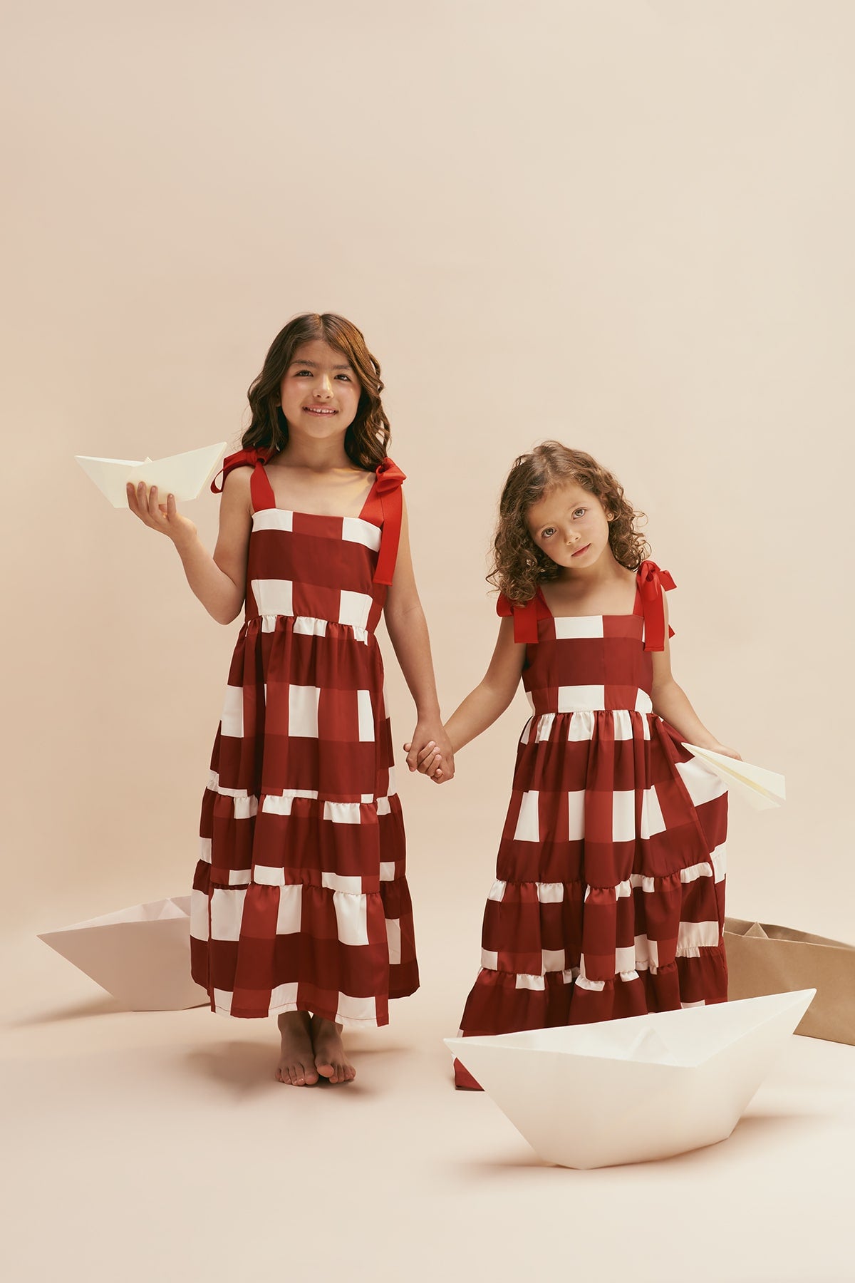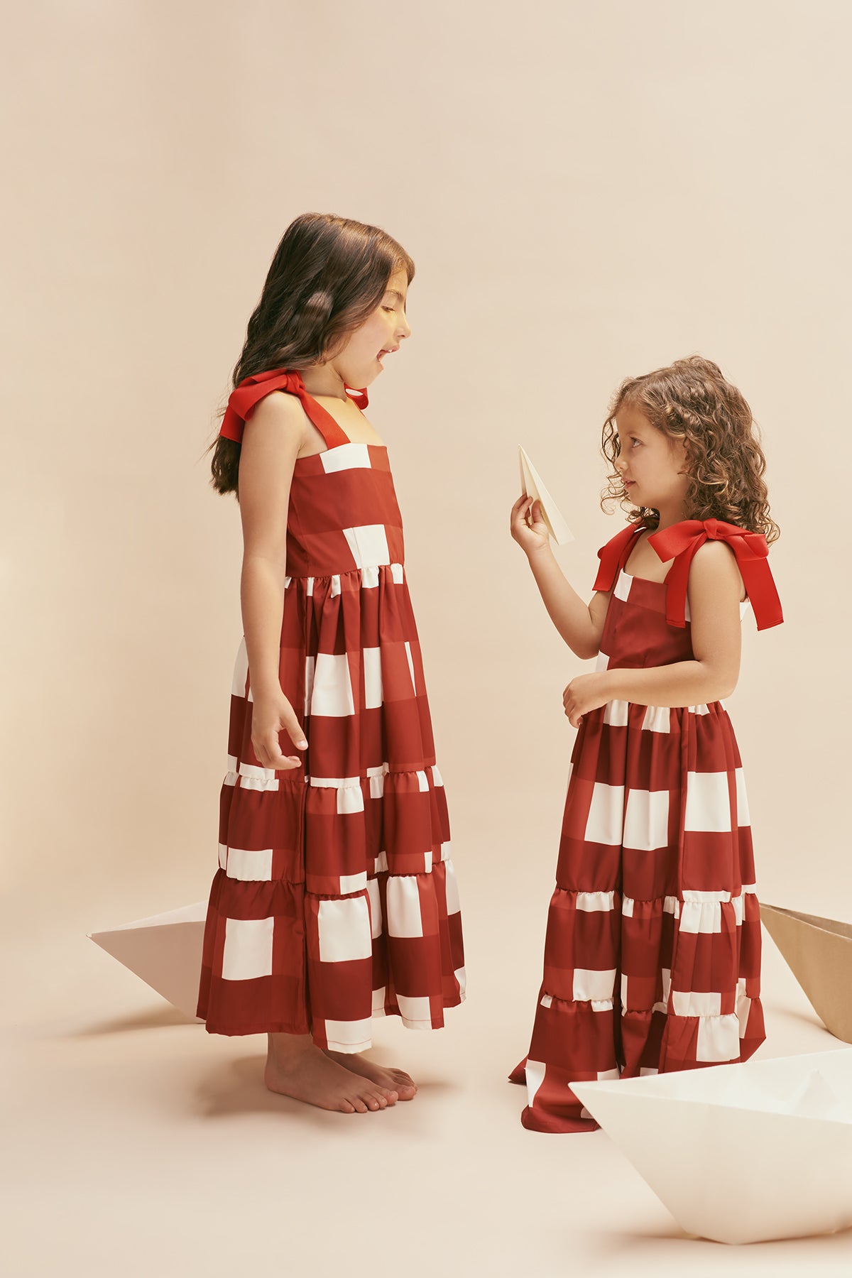 Presentamos el Nazaret Mini, una prenda encantadora y vibrante diseñada para la comodidad y el estilo de las más pequeñas. Este vestido de corte recto destaca por sus coquetas cintas ajustables en los hombros, que permiten un ajuste perfecto y añaden un toque delicado. Su falda, dividida en tramos, crea un movimiento divertido y dinámico, adornada con un alegre estampado de cuadros en tonos rojos que irradian energía y alegría.