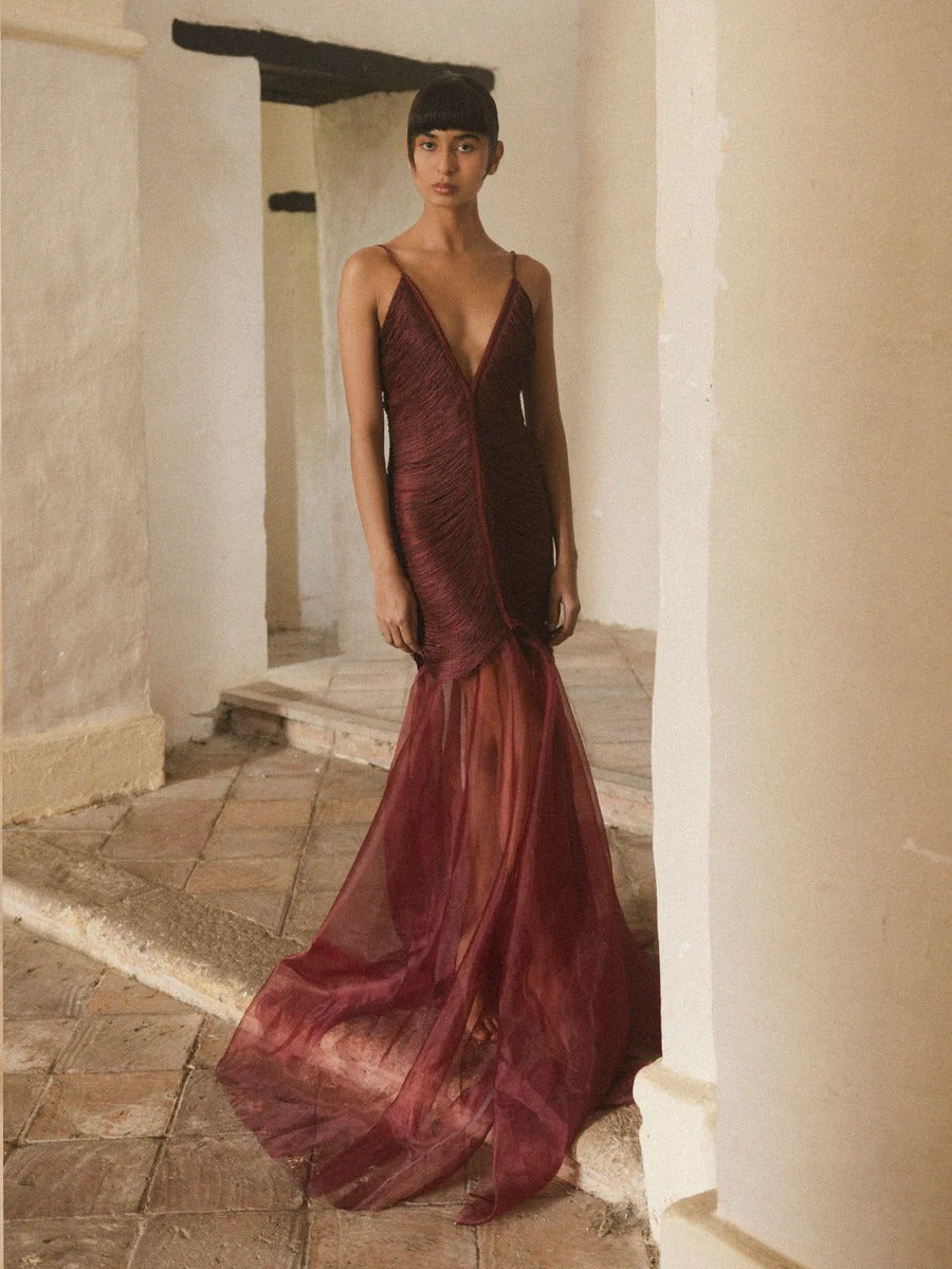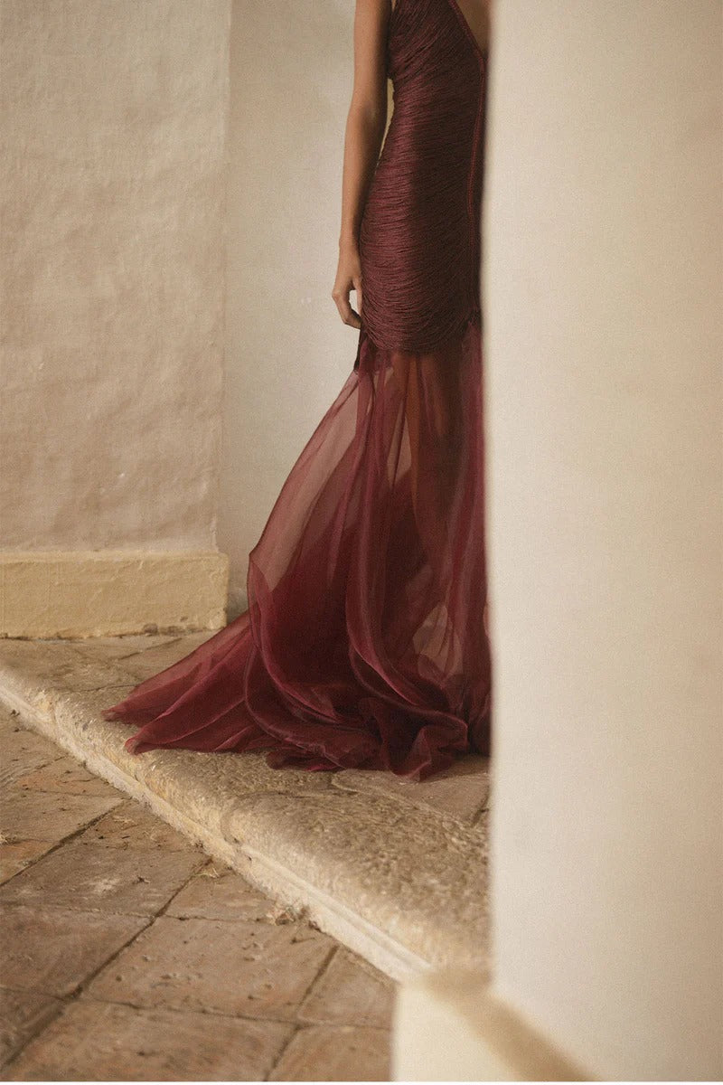 El Vestido Nostalgia es una obra maestra de alta costura que fusiona estructura y sensualidad con una gracia natural. Su intenso tono burdeos evoca fuerza y misterio, mientras que el pronunciado escote en V y el corpiño ajustado realzan sutilmente la feminidad. La falda de corte sirena, rematada con una capa de tul translúcido, aporta movimiento etéreo y una sofisticación atemporal. Perfecto para eventos de alfombra roja, bodas modernas o momentos de moda editorial.