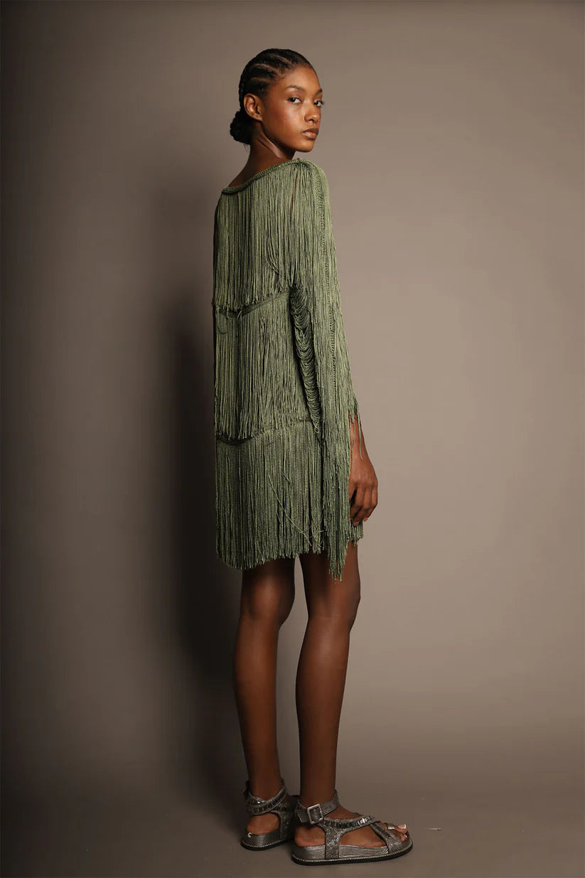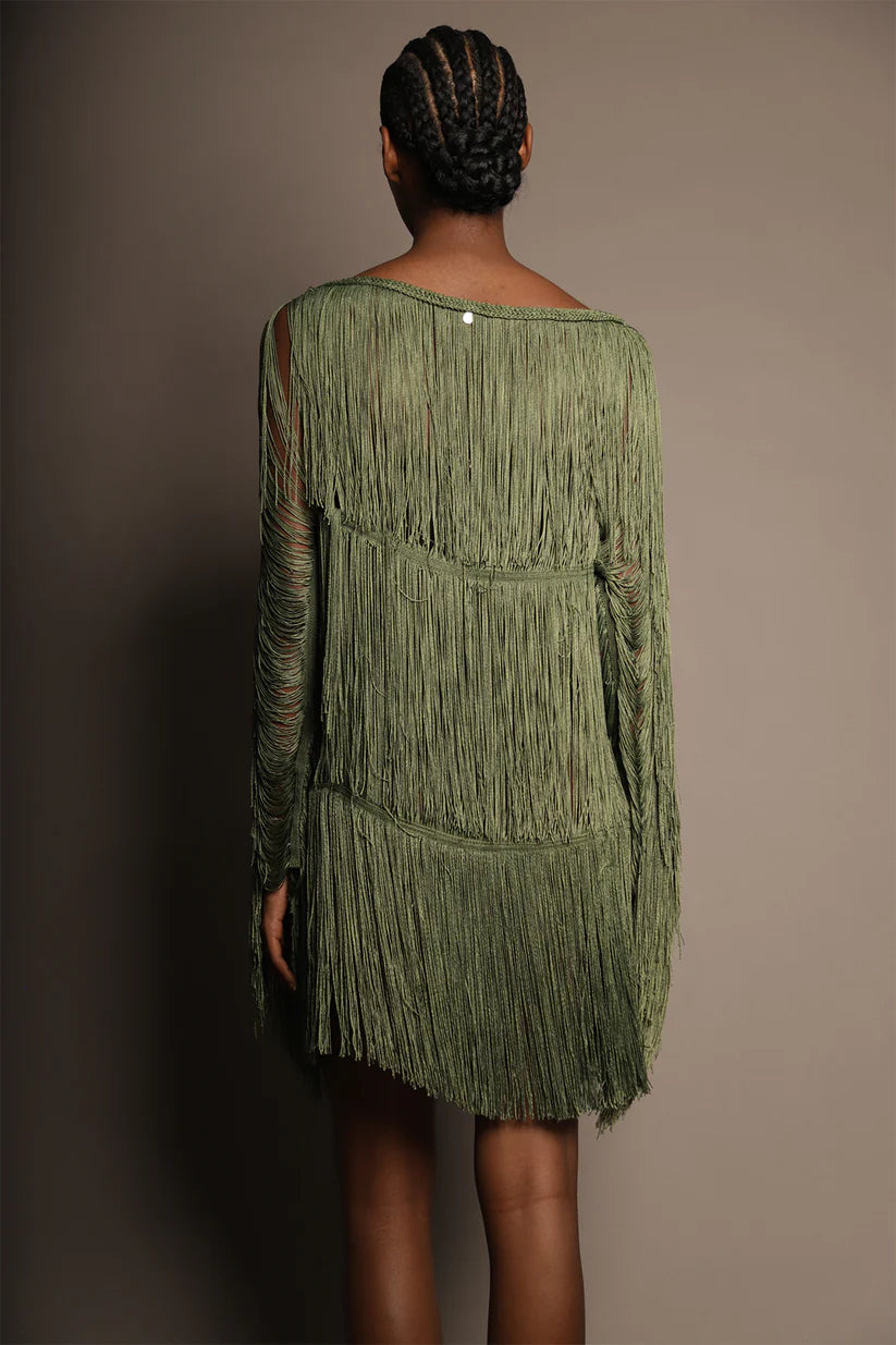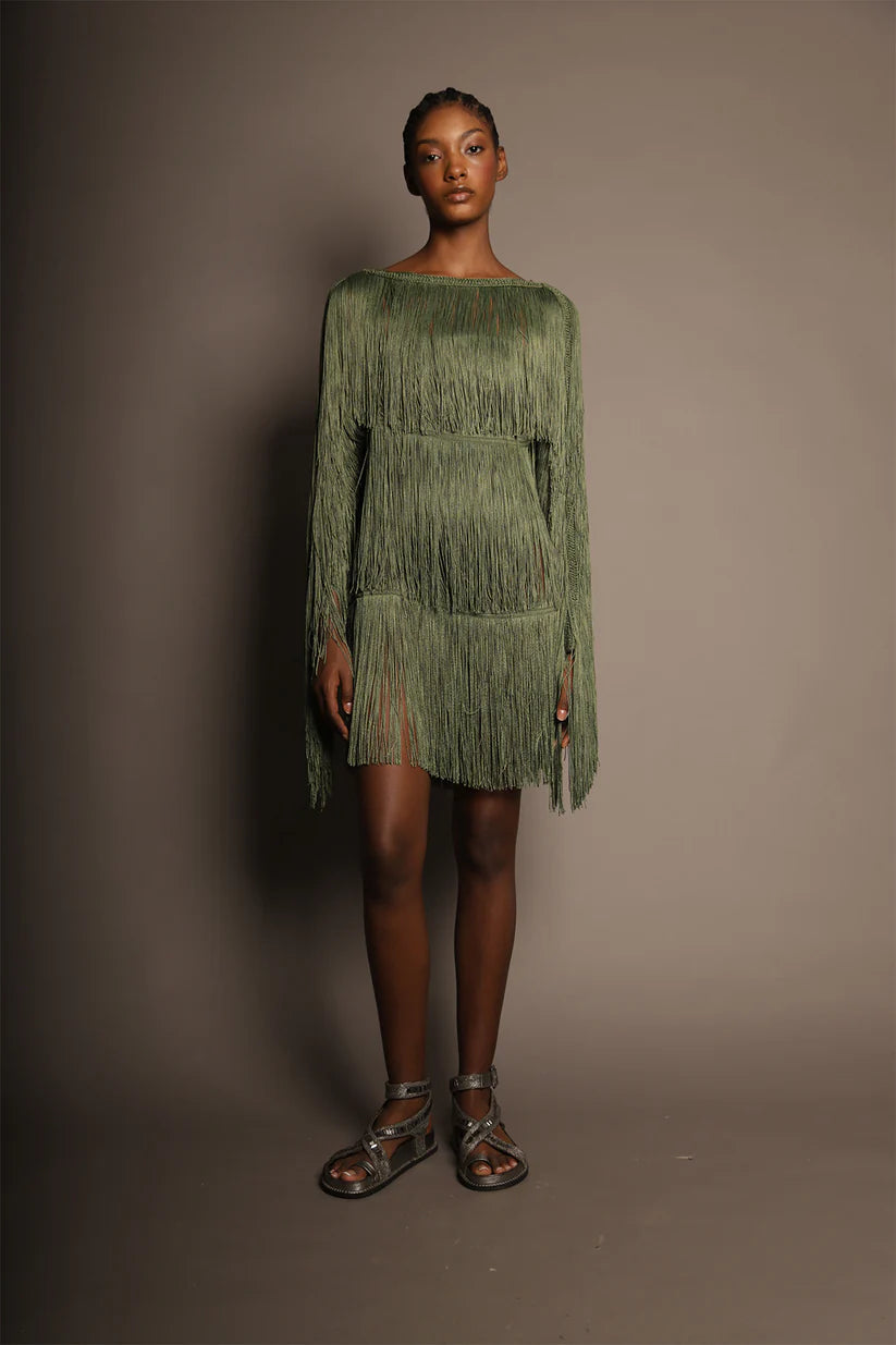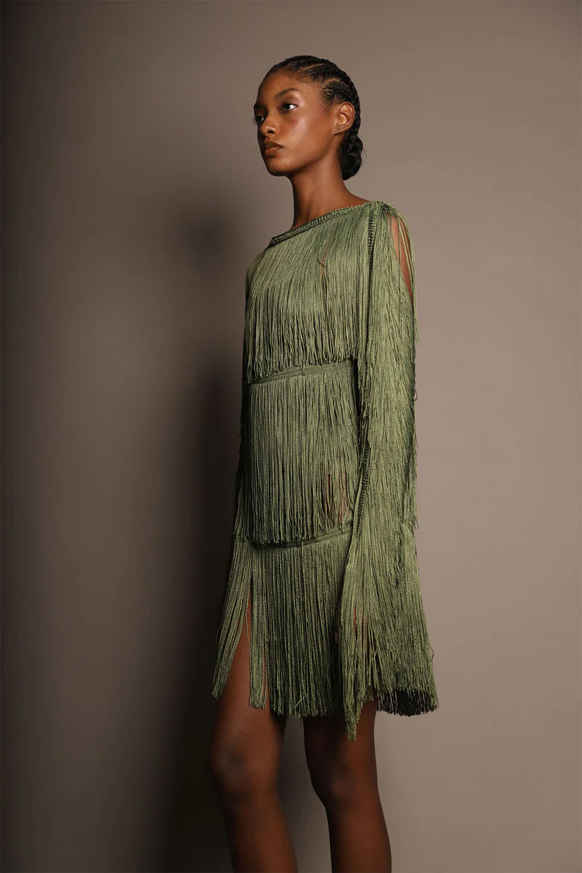 Pieza creada con flecos en campana, irradia un estilo vibrante. Con un cuello bandeja y mangas largas, se complementa con capas de flecos sueltos que aportan un toque dinámico y elegante, generando un movimiento fluido y sofisticado en cada paso. Perfecta para quienes buscan destacar con un diseño audaz y encantador.