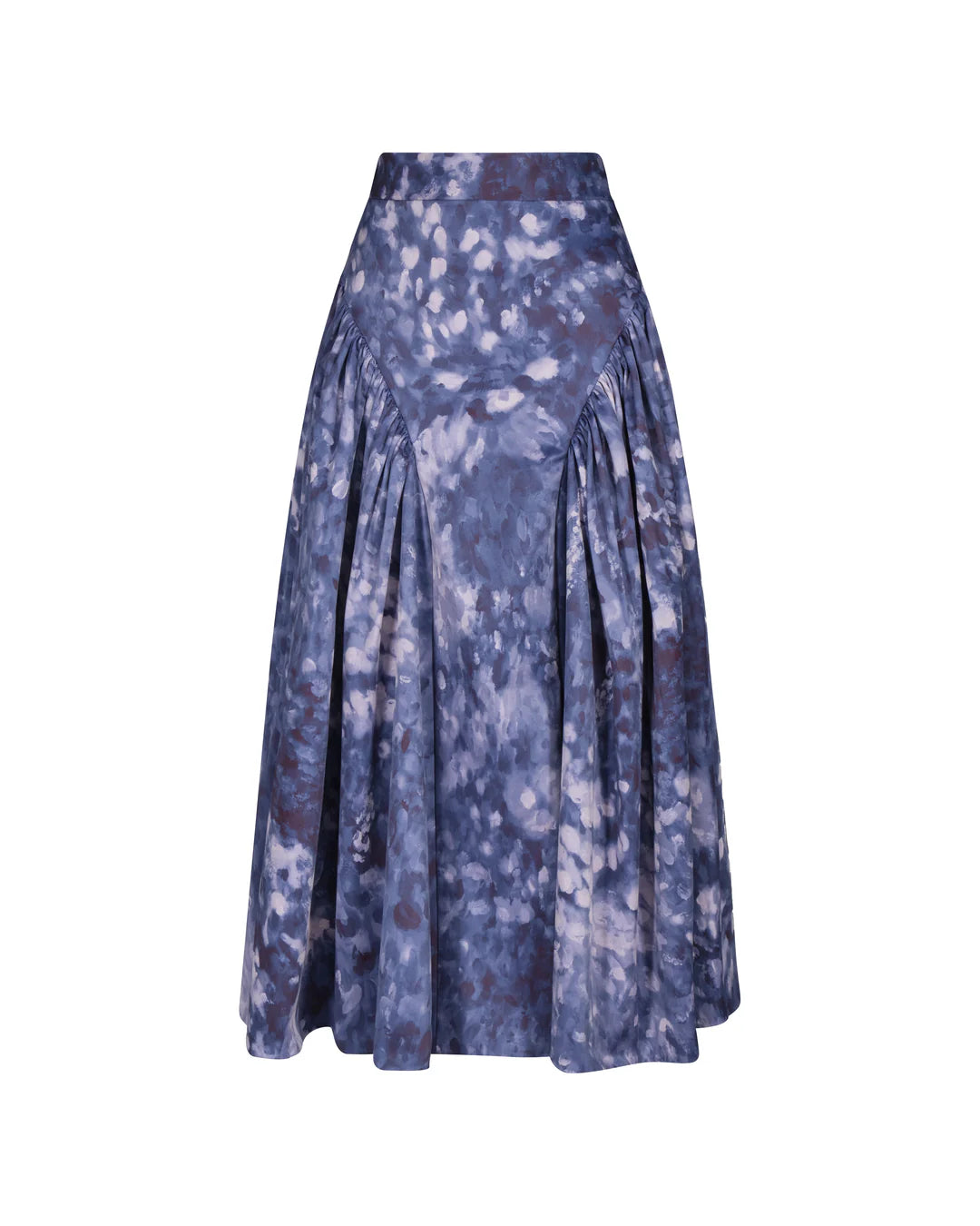 La falda midi Begonia presenta cintura alta y un fruncido suave que se extiende hasta una silueta amplia y evasé. Confeccionada en un estampado azul violeta, ofrece movimiento y elegancia, convirtiéndola en una prenda destacada tanto para el día como para la noche.