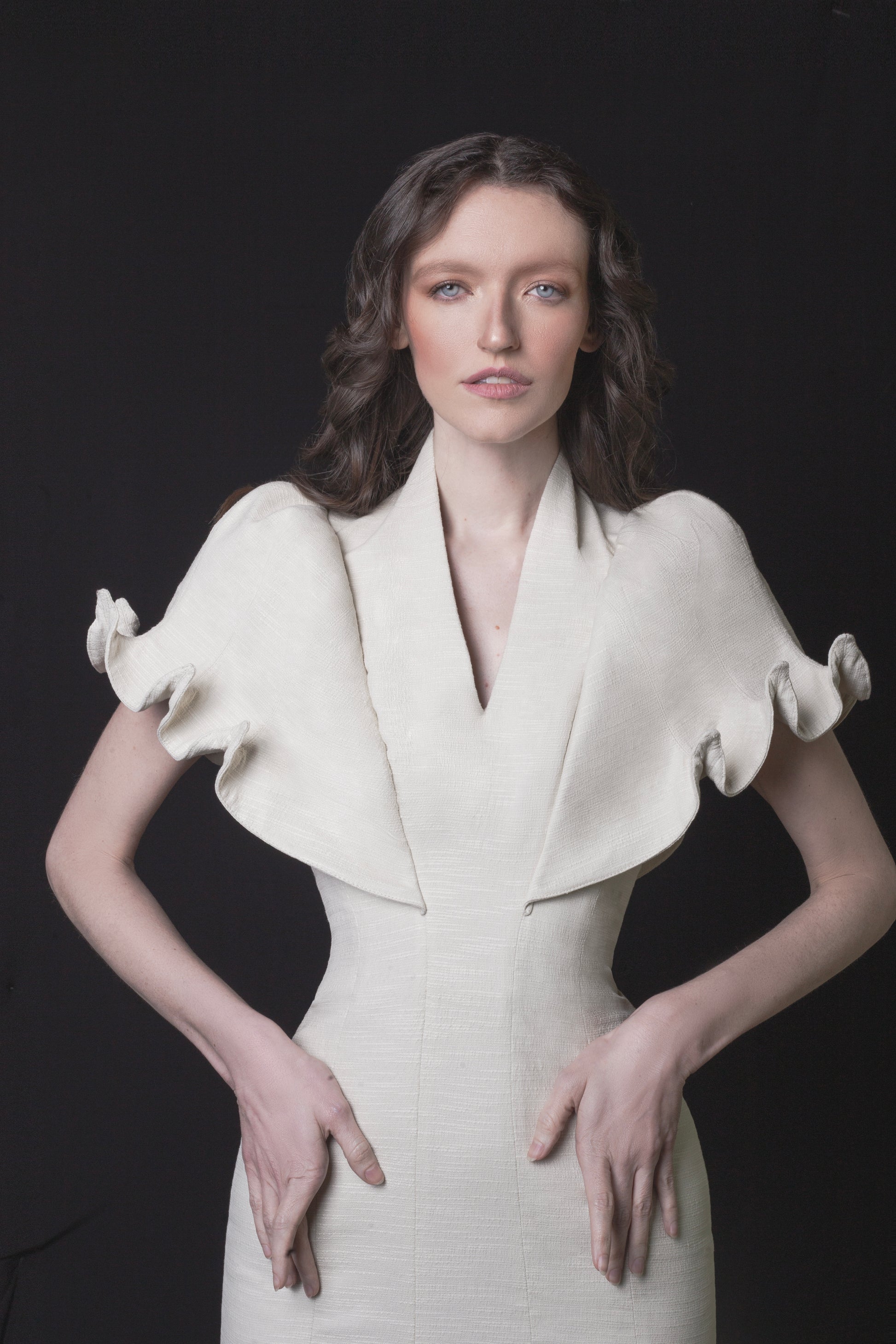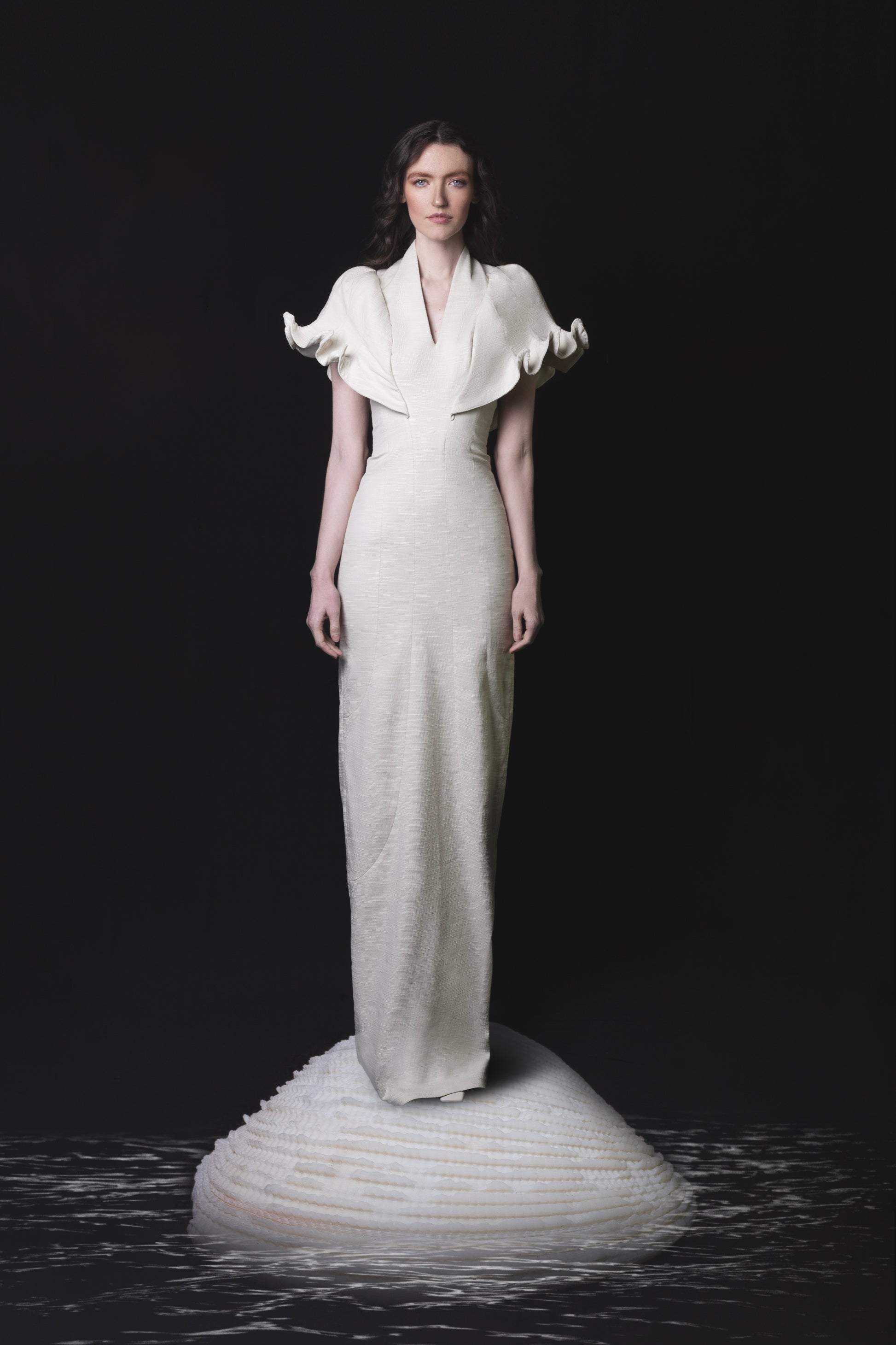 Inspirado en la perfección de la naturaleza, el vestido Perla destaca por su silueta fluida que se ciñe delicadamente al cuerpo. El punto focal reside en sus hombros arquitectónicos, adornados con volantes rígidos que imitan las ondas y texturas de una concha marina. Confeccionado en un tejido con sutil brillo irisado, esta pieza es la máxima expresión de la feminidad contemporánea y sofisticada.