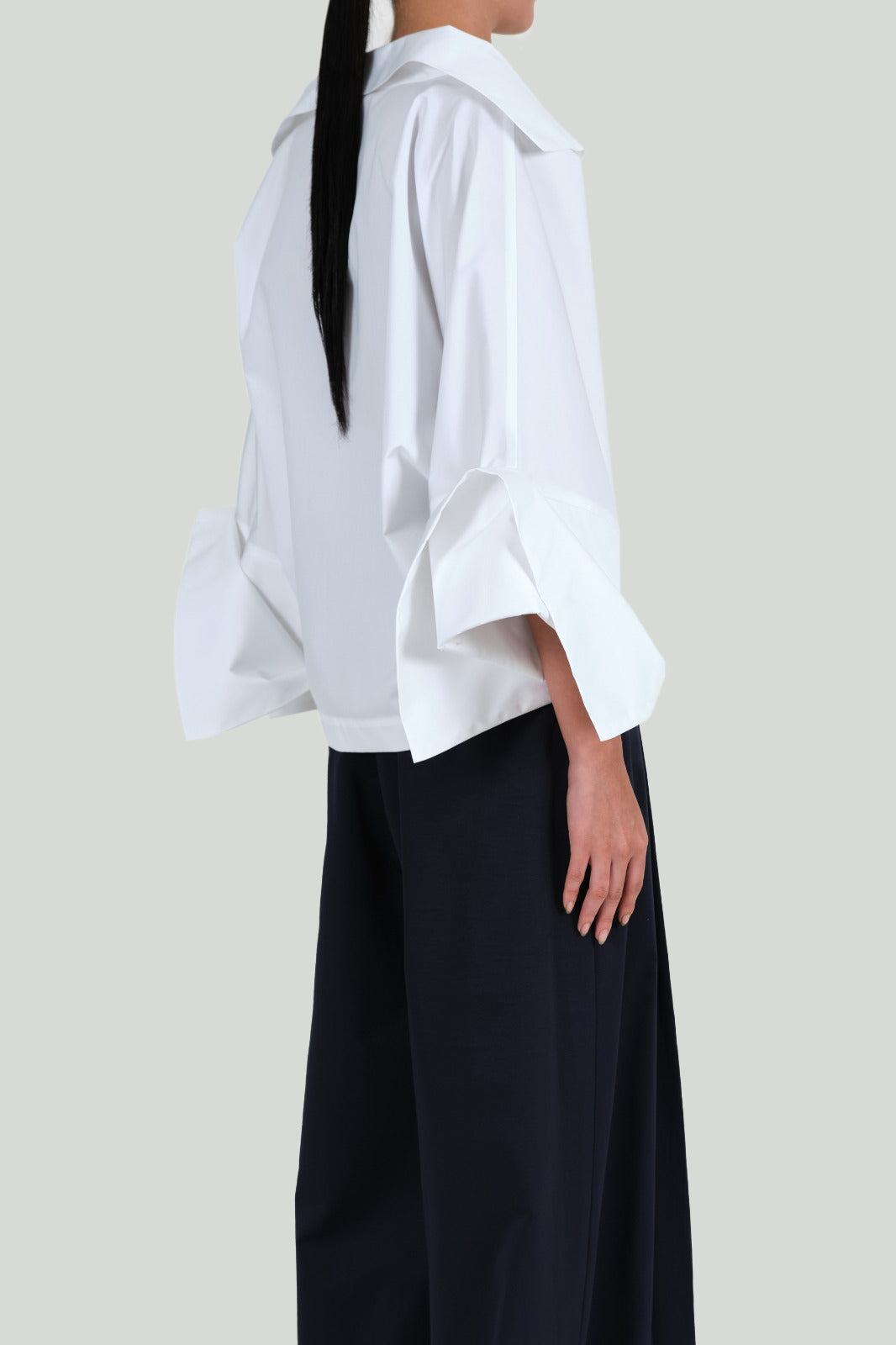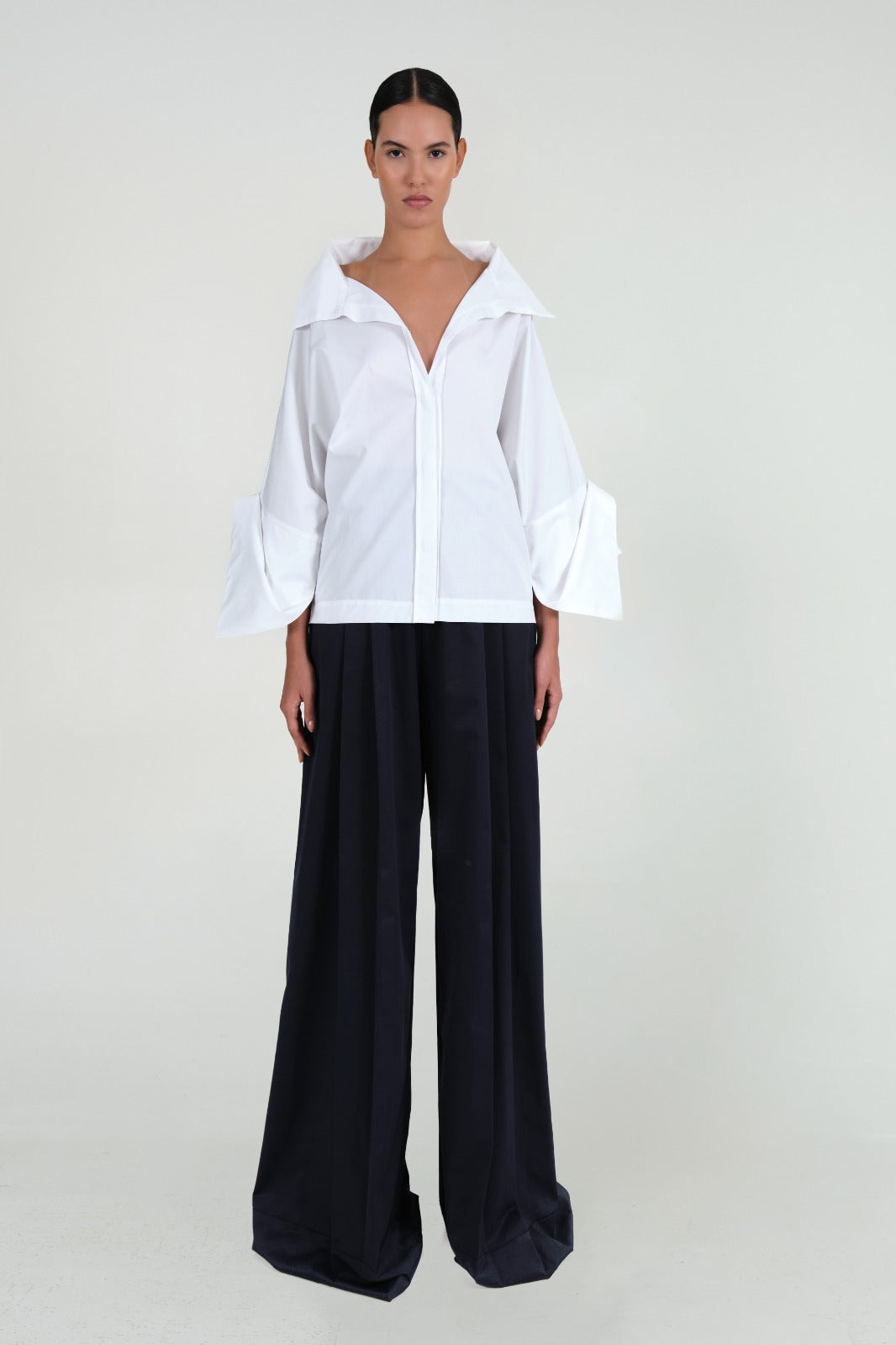 SET DE CAMISA BLANCA DE VESTIR, CON PANTALON AZUL DE VESTIR Y MANTO PARA DARLE UN TOQUE DIFERENTE EL OUTFIT