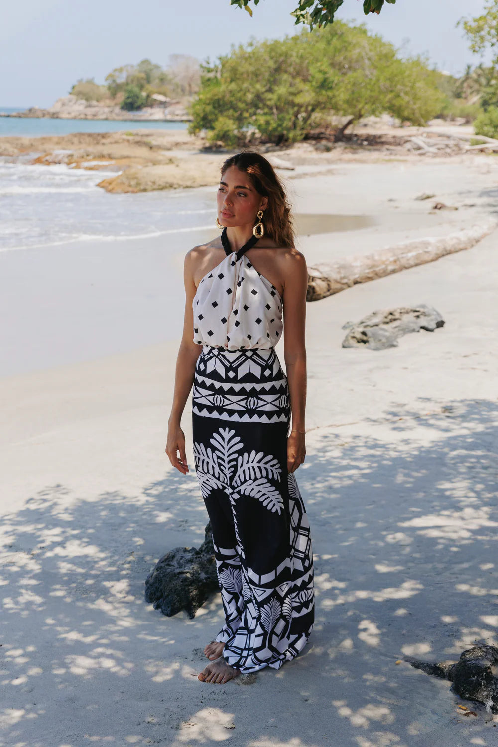 Top de corte halter se destaca por su escote drapeado que fluye suavemente desde una trenza artesanal en tono contrastante que rodea el cuello, aportando un detalle único y elegante. El diseño sin mangas realza los hombros y deja la espalda parcialmente descubierta, mientras que el estampado geométrico en blanco y negro añade un toque gráfico moderno.