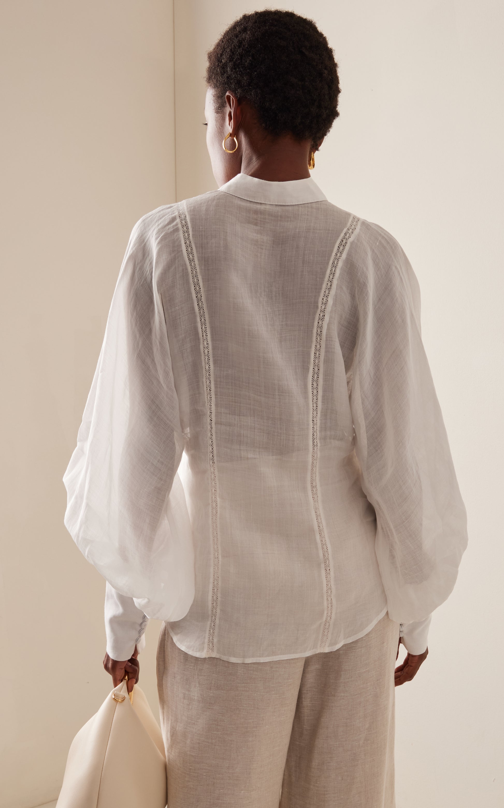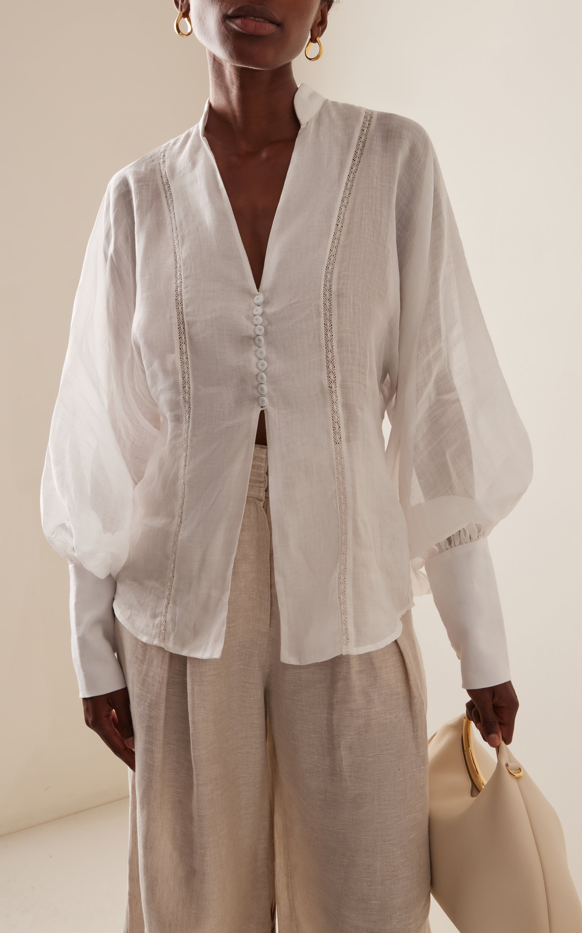 'Rocas Del Mar' es una blusa de gran tamaño y cómoda, confeccionada en lino fluido y transpirable, y con mangas onduladas que se cierran en las muñecas.