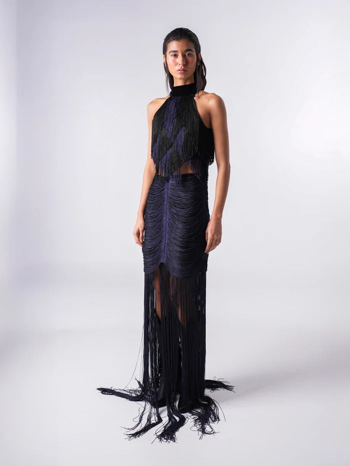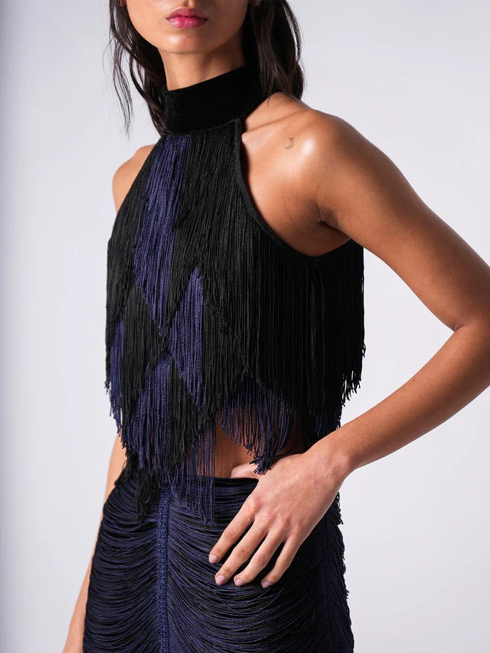 Diseño atrevido que combina artesanía y sensualidad. Este top presenta un cuello alto de terciopelo negro y flecos anudados a mano en tonos negro y azul intenso que caen en cascada sobre el busto. La espalda abierta realza sutilmente la silueta con elegancia.