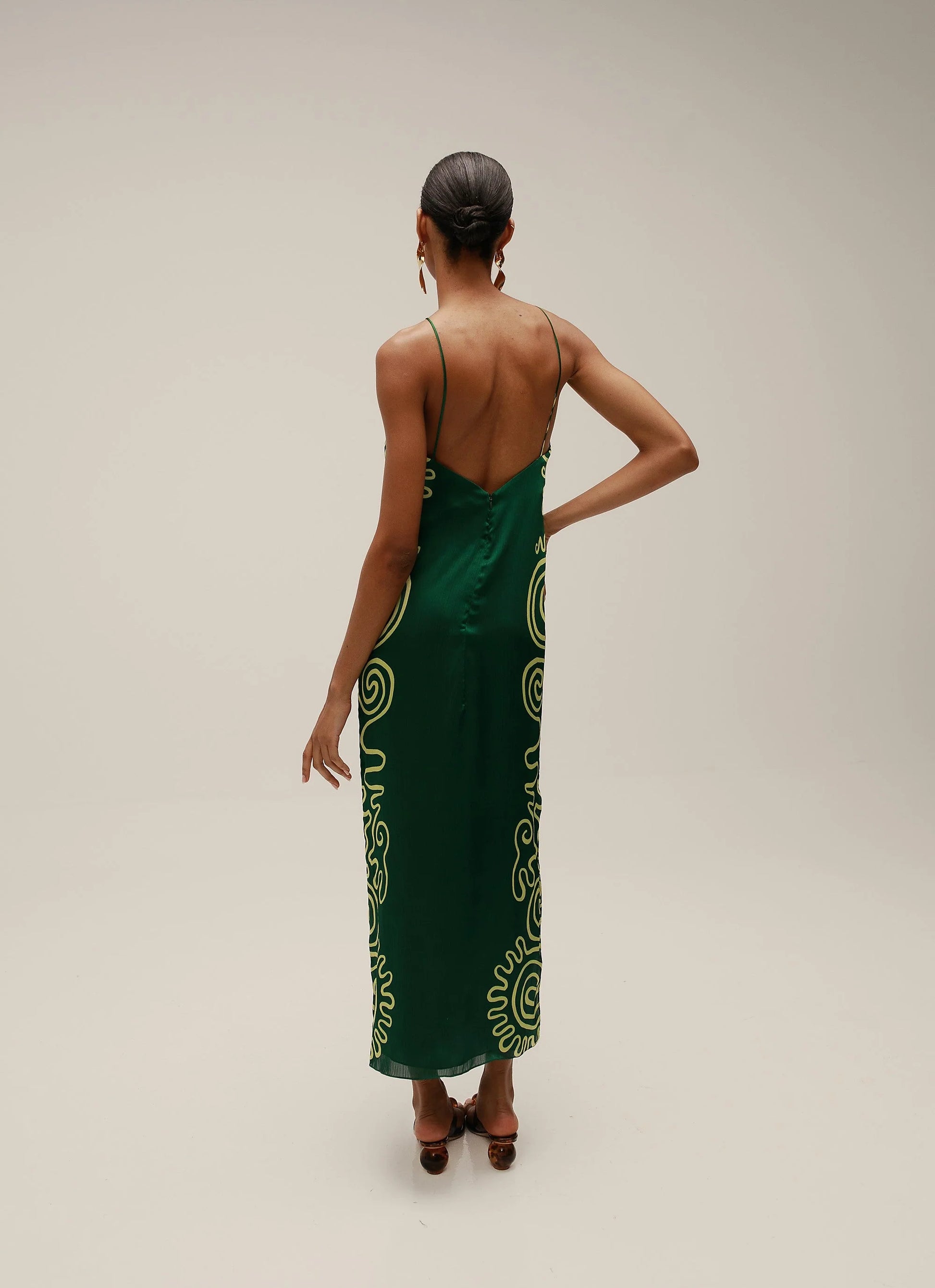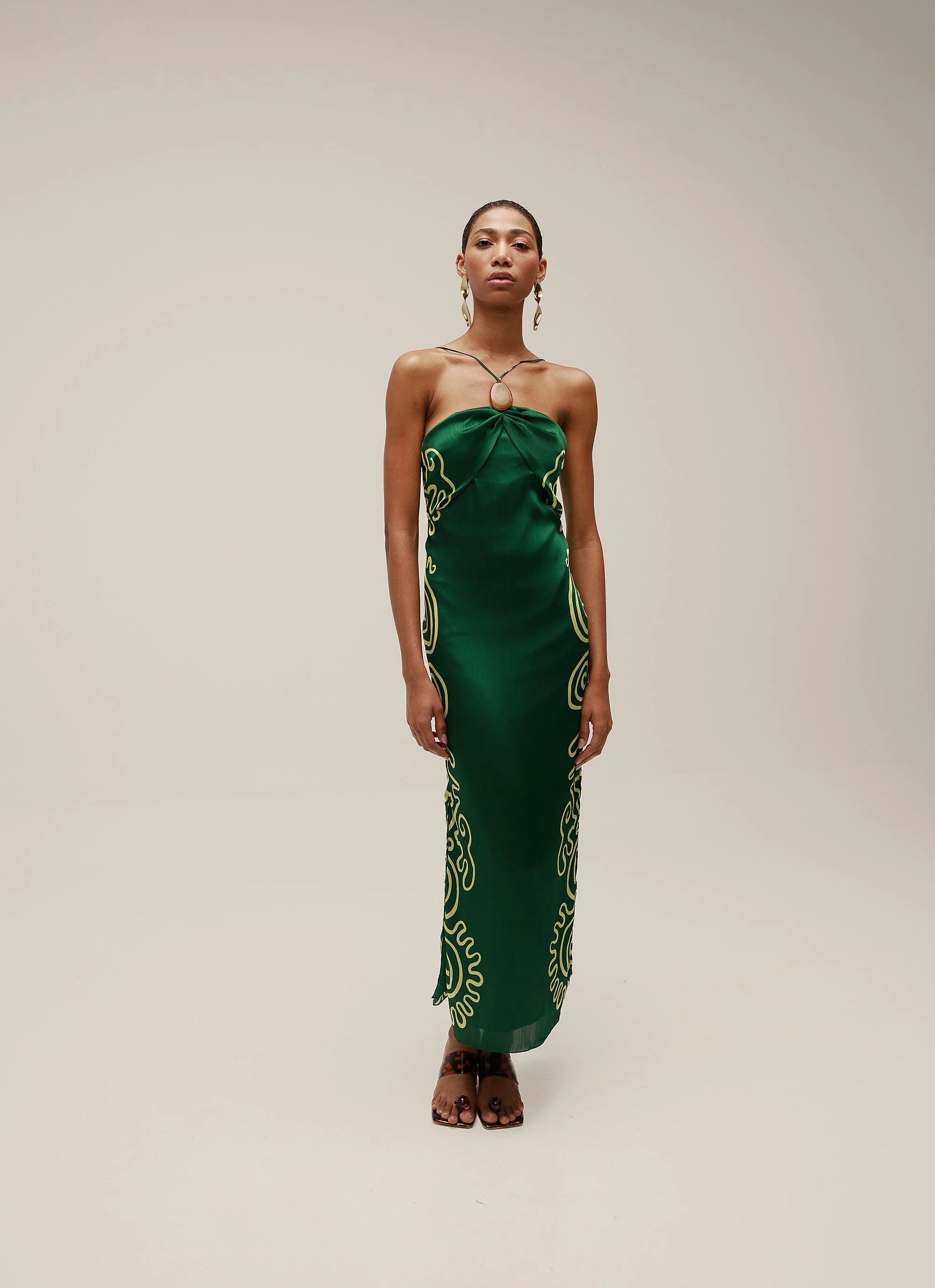 Vestido largo estilo halter con piedra extra grande en tirantes.