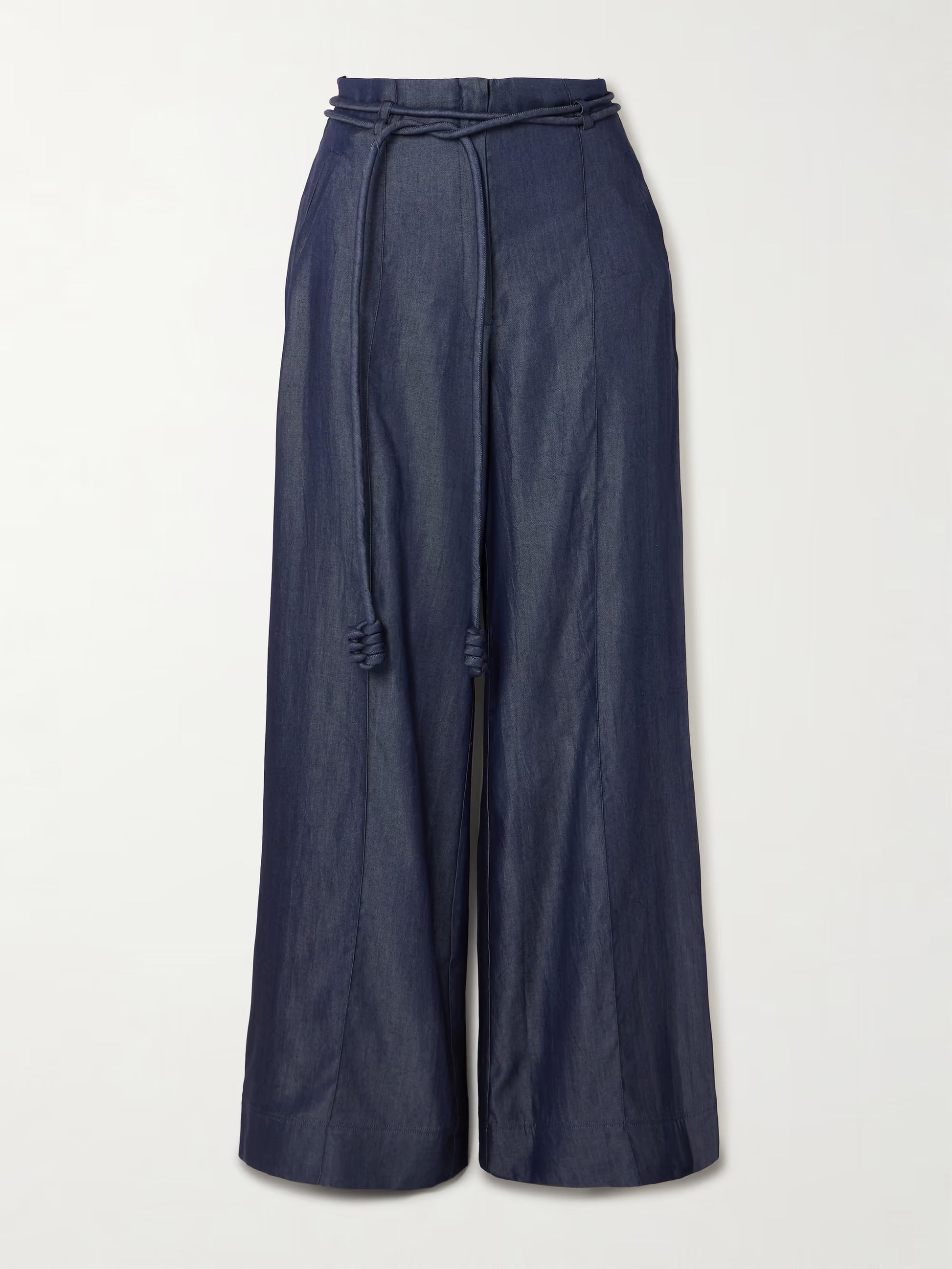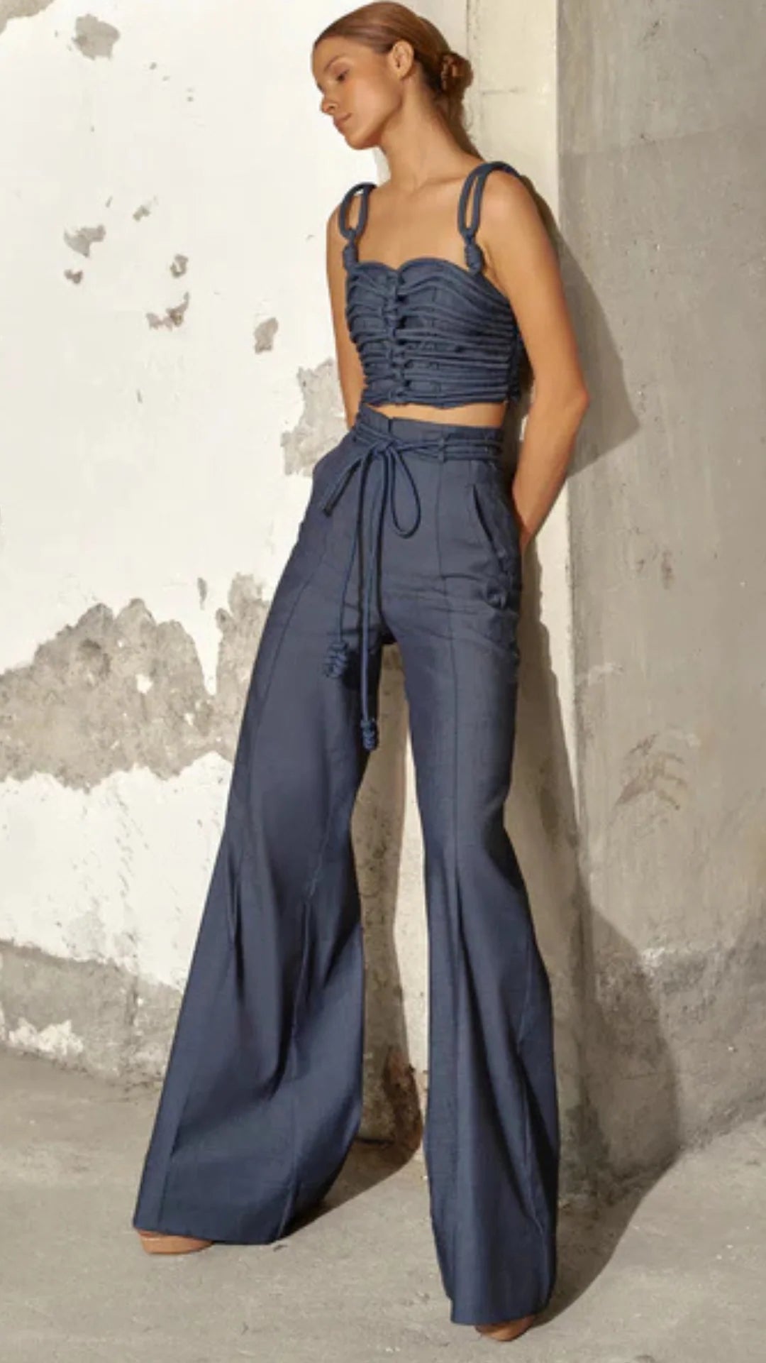 Este es un elegante conjunto de dos piezas en un tono azul marino con un acabado que simula el denim. El set está compuesto por un top estilo corset con frunces en el centro, tirantes gruesos y detalles de lazos. La parte inferior son unos pantalones de corte ancho y acampanado, de tiro alto, que estilizan la figura y tienen una cintura ajustada con un cordón decorativo.