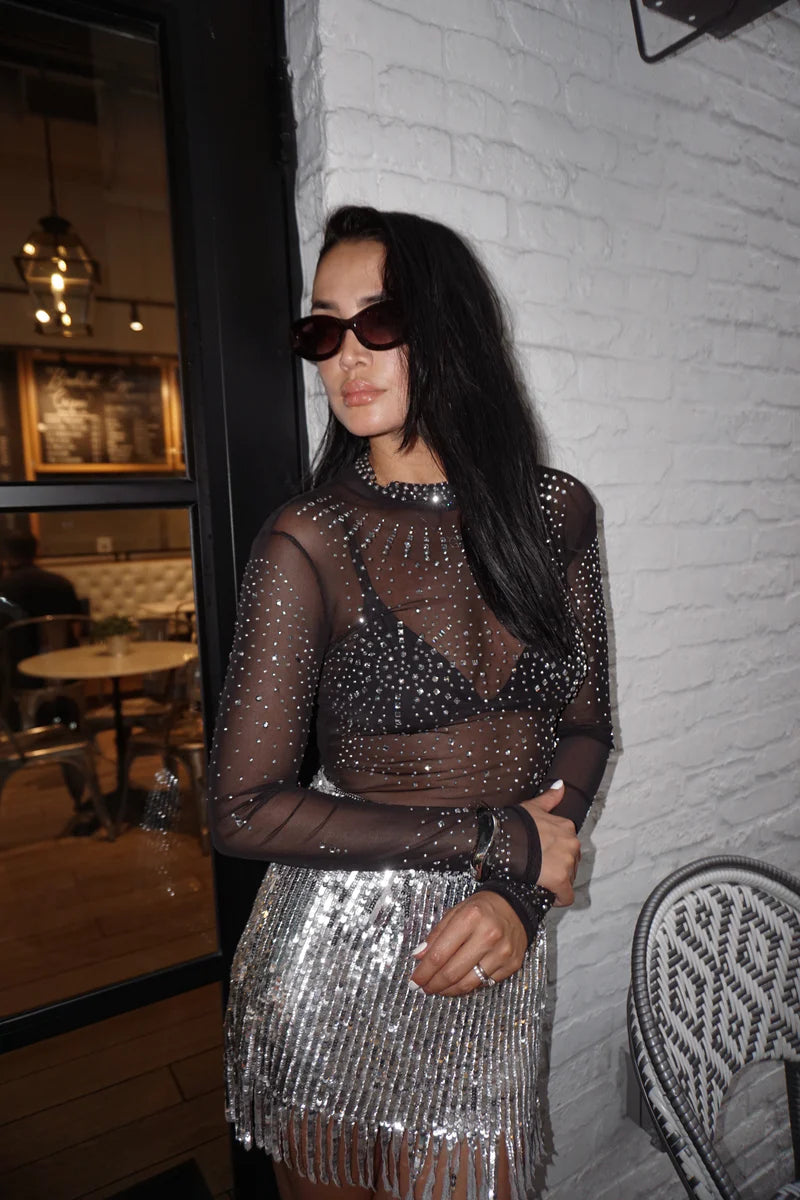 TOP DE MALLA BORDADO PLATEADO Y FALDA DE LENTEJUELAS