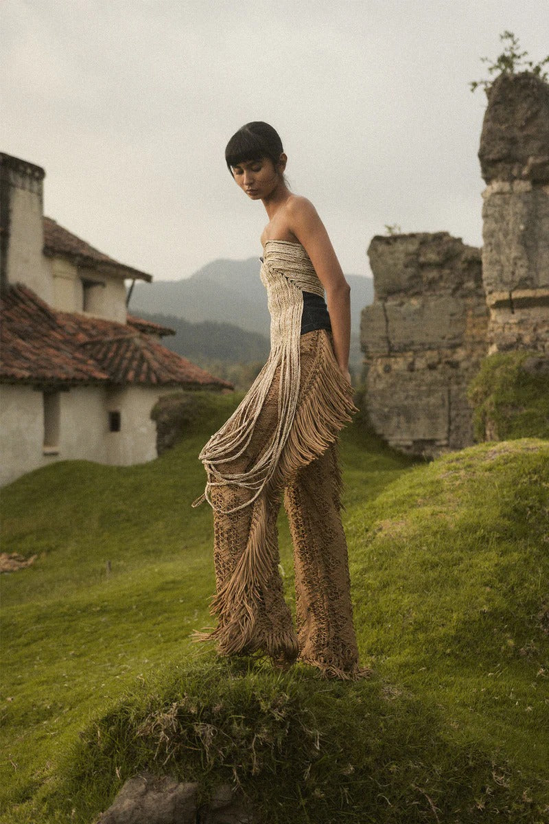 Este set artesanal es una obra maestra de diseño, compuesto por un corsé y un pantalón que se complementan a la perfección. El corsé presenta una silueta esculpida con escote corazón, tejido con hilos beige y dorados que crean una textura de espiga, realzada por largos flecos frontales que aportan fluidez y dramatismo. La espalda contrasta con un denim intenso y una cremallera dorada visible, dándole al diseño un toque contemporáneo.