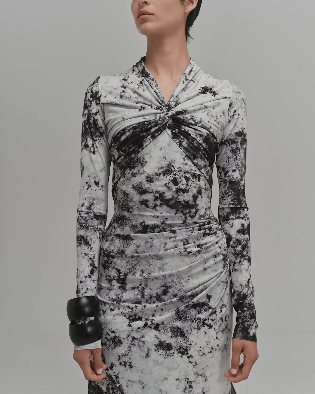El vestido largo «Tallo» ofrece una sofisticación elegante gracias a su silueta ajustada y proporciones alargadas. Con un detalle frontal retorcido que acentúa el escote, mangas largas y un bajo que llega hasta el suelo, está confeccionado con el estampado Nostalgia en blanco y negro para un acabado audaz y refinado que combina a la perfección con el día y la noche.