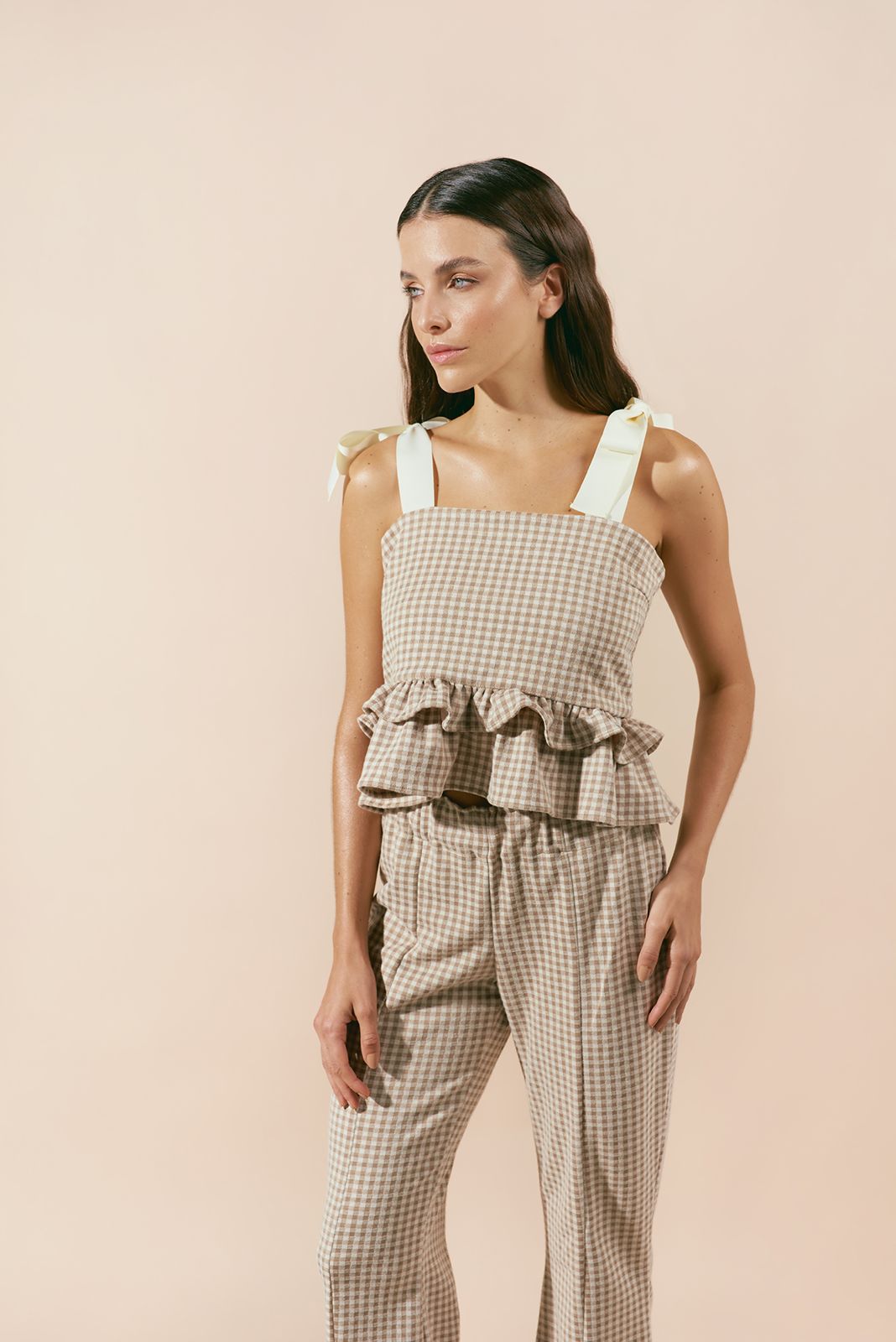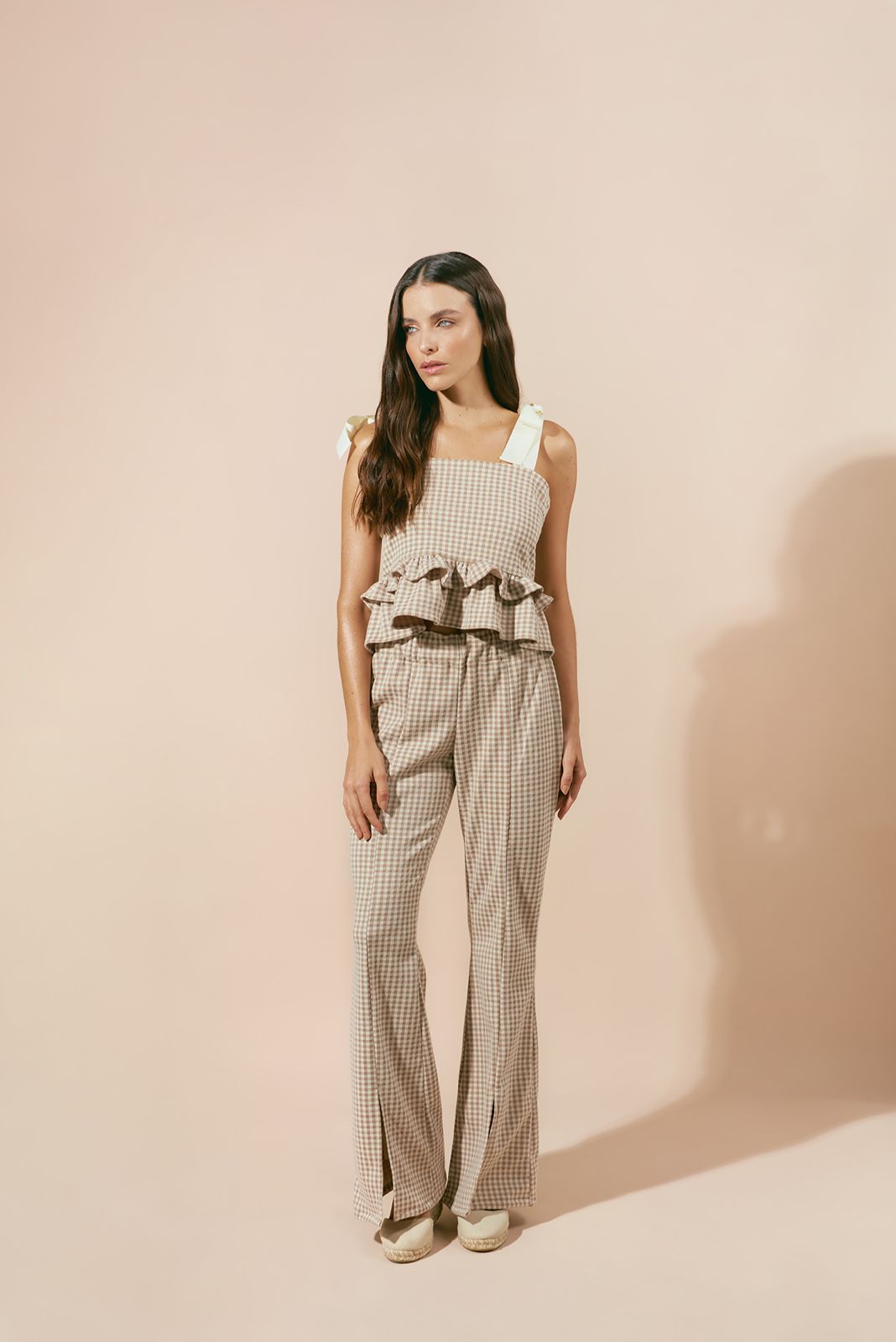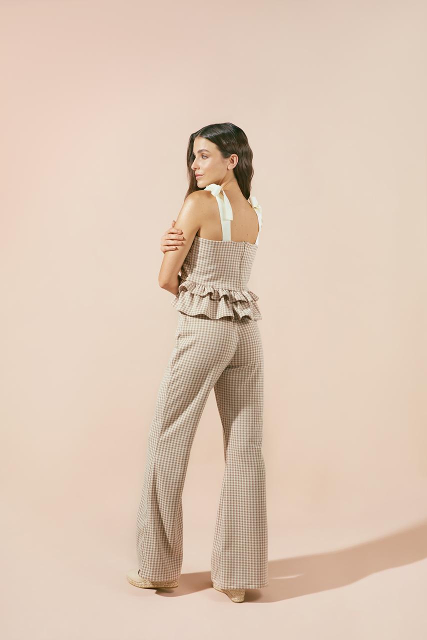 Complementando el top, el pantalón de corte recto y pierna ancha ofrece una comodidad excepcional, con una abertura discreta en el bajo que añade un toque moderno y permite una mayor fluidez al caminar. Ambas piezas lucen un patrón de cuadros vichy en suaves tonos tierra y crema, que evocan una estética campestre chic y atemporal.