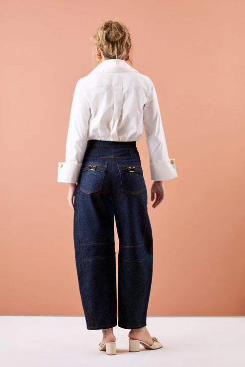 Estos jeans de tiro alto presentan una silueta de pernera acampanada con bolsillos de parche extragrandes y costuras en contraste para un look estructurado. La espalda luce herrajes dorados y costuras detalladas que le dan mayor dimensión. Confeccionados en denim oscuro, combinan un estilo casual con un estilo sofisticado.