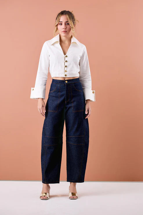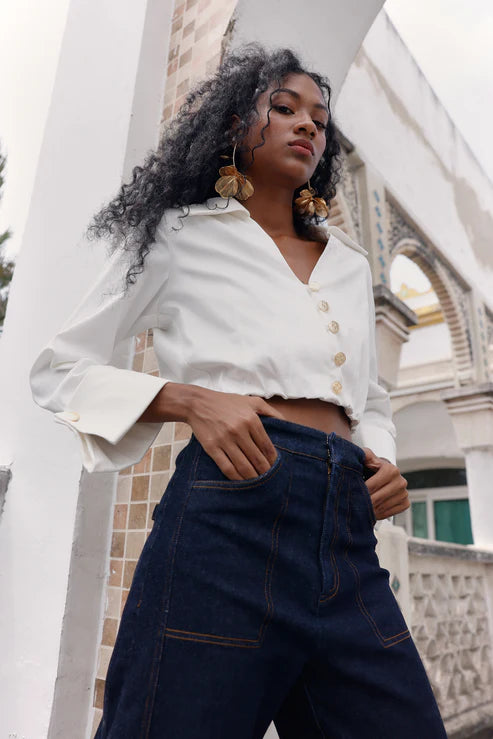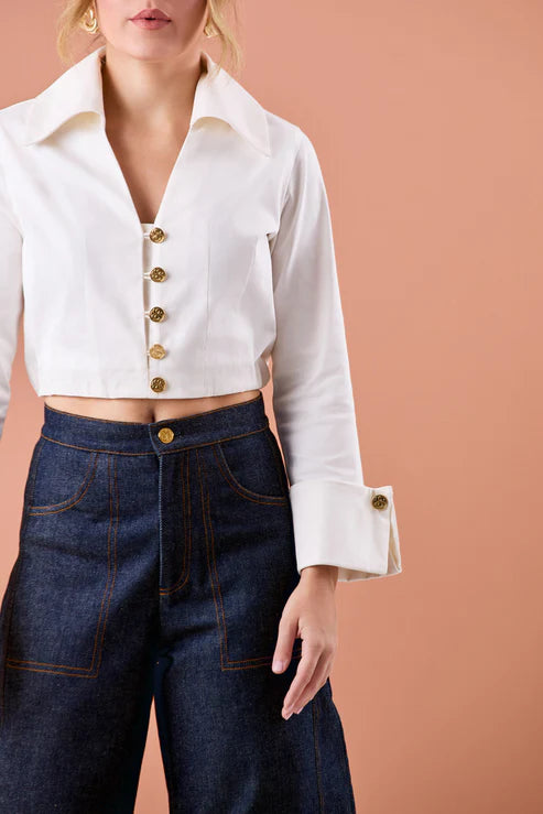 Este top corto abotonado presenta un cuello ancho y elegante, mangas largas estructuradas con puños franceses extragrandes. Las pinzas a medida realzan la silueta ajustada, mientras que los botones dorados le dan un toque de lujo. Su impecable tela de algodón blanco le da un aspecto refinado, perfecto para combinar con pantalones de cintura alta.