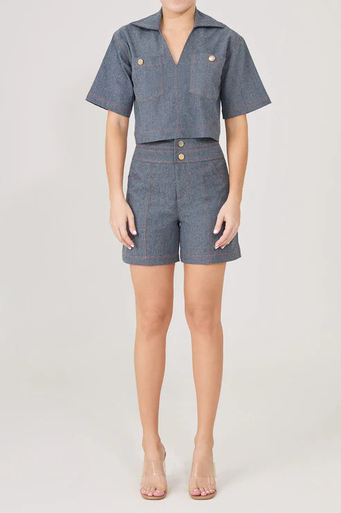Un conjunto juvenil e informal con detalles de costuras naranjas y nuestros característicos botones dorados. El top tiene una horma ancha con mangas en A y bolsillos delanteros, mientras que los shorts tienen una horma suelta con doble cinturilla y bolsillos superpuestos. ¡