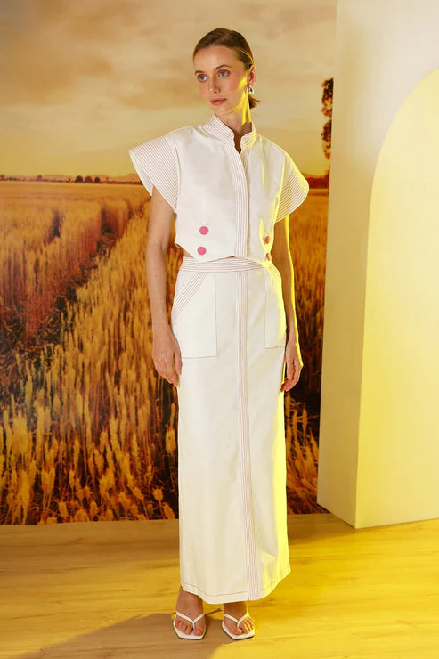 Este conjunto versátil, moderno y moderno será la opción ideal para cualquier ocasión. Con costuras rosas en contraste y botones decorativos en la parte superior, presenta una silueta única y moderna. La falda es recta, con bolsillos y cintura ancha. ¡Llévalos juntos o combínalos con jeans y otras prendas para crear looks sofisticados! Perfectos para un brunch o un evento elegante de día.