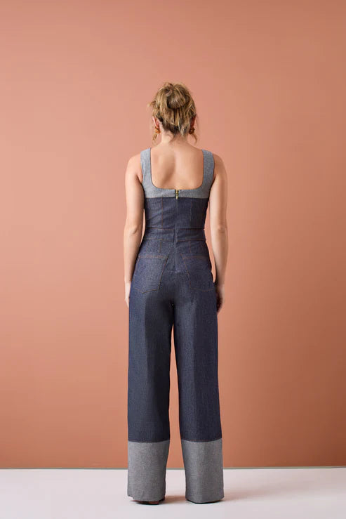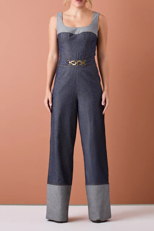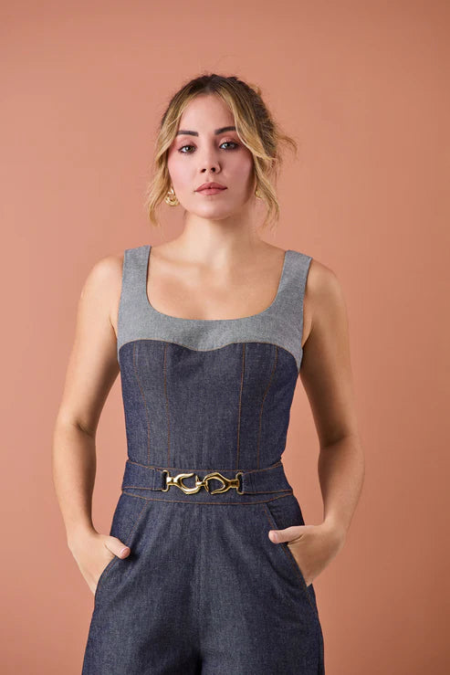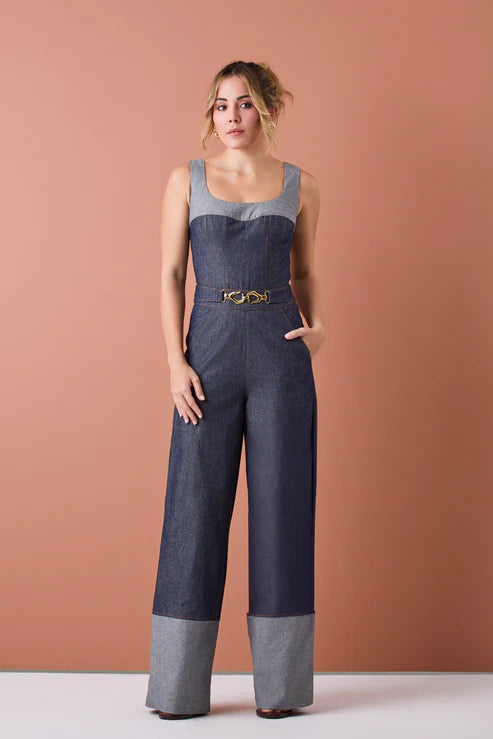Este elegante mono presenta un diseño vaquero en contraste con un corpiño ajustado y estructurado y pantalones de pernera ancha. El escote cuadrado y las líneas limpias realzan su estética moderna y minimalista, mientras que el cinturón dorado le aporta un toque de lujo.
