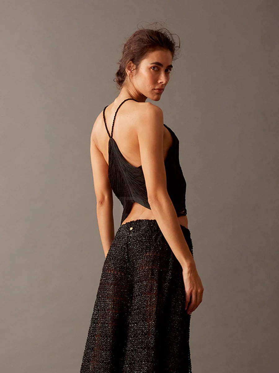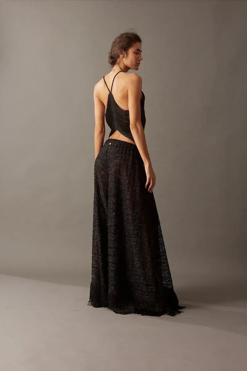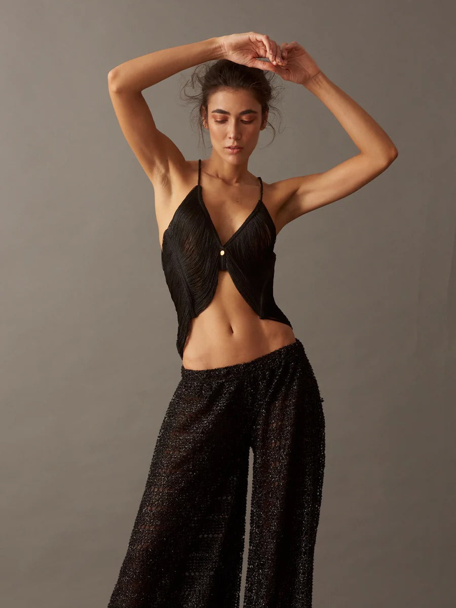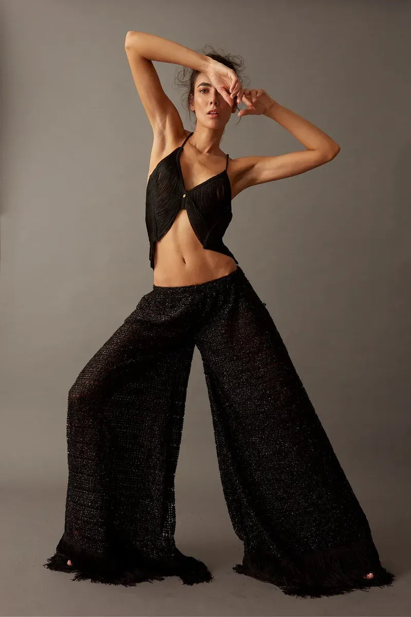 Les presentamos nuestro Top Siara and Glow Pant Set, una combinación perfecta de elegancia y atrevimiento diseñada para realzar tu figura con sofisticación. El Top SIARA destaca por su escote profundo con delicados flecos artesanales que definen la silueta con fluida elegancia. Confeccionado sobre una base estructurada, realza el torso, mientras que los tirantes trenzados le aportan un acabado suave y etéreo. La caída asimétrica frontal añade movimiento, ideal para ocasiones refinadas que exigen elegancia contemporánea.
