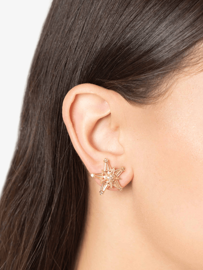 Aretes en plata de ley 990 y bronce con baño en oro rodio, oro rosa e incrustación de cristales color cristal y champaña.