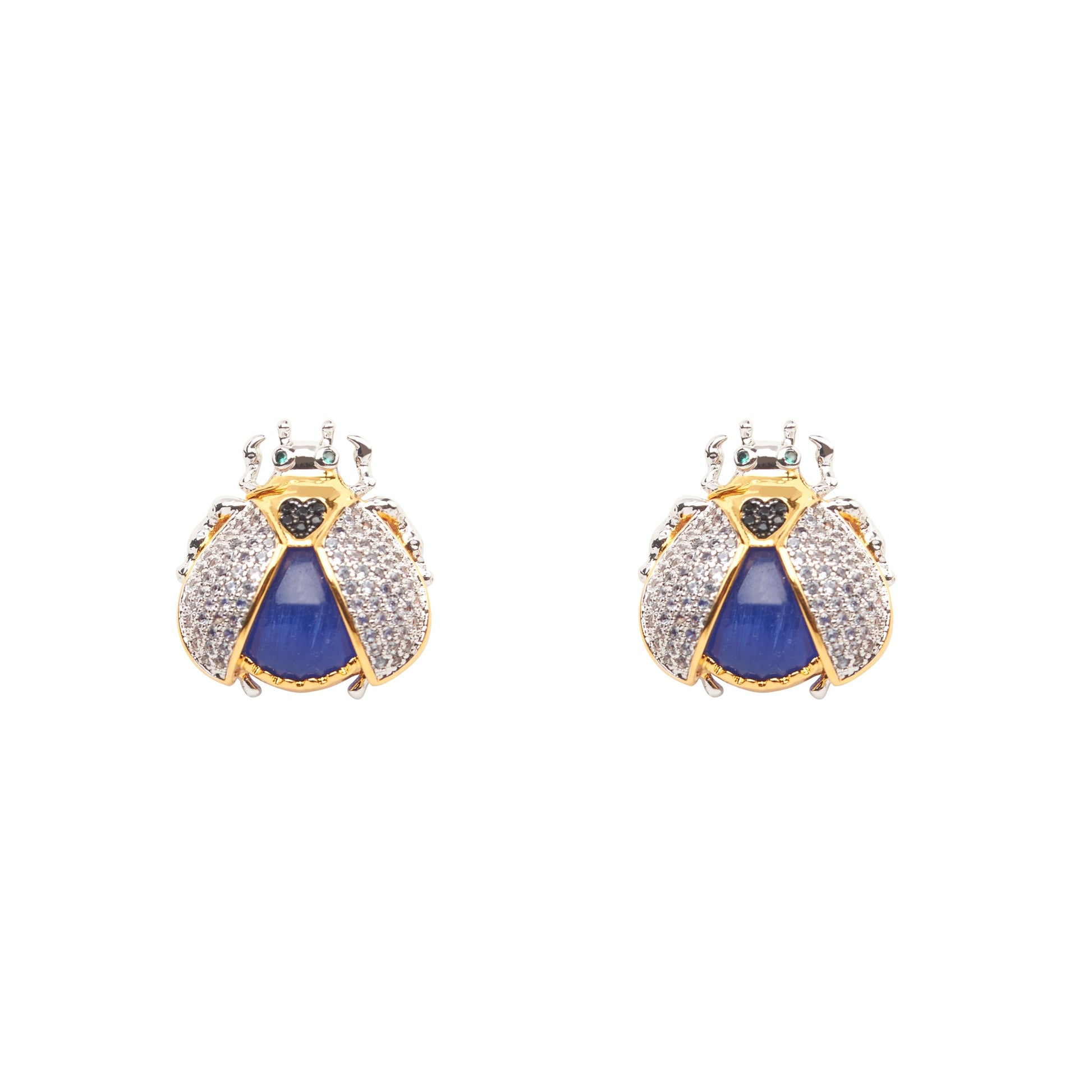 Pequeñas obras de arte que capturan la magia de la naturaleza en su forma más elegante. Los Topos Mariquita Ojo de Gato azul combinan el bronce con un delicado baño de oro de 18k y destellos de rodio blanco y negro. Sus alas, decoradas con cristales transparentes crean un contraste luminoso. El detalle central, una piedra ojo de gato color azul, evoca pureza y misterio, perfecto para quienes aman los accesorios con personalidad y un toque sofisticado.