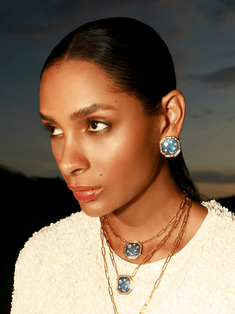 Los topos están elaborados en metal bronce con baño de oro de 18 kilates, baño de rodio blanco y negro e incrustación de microcristales color zafiro y cristal, enmarcados por relucientes cristales baguette.