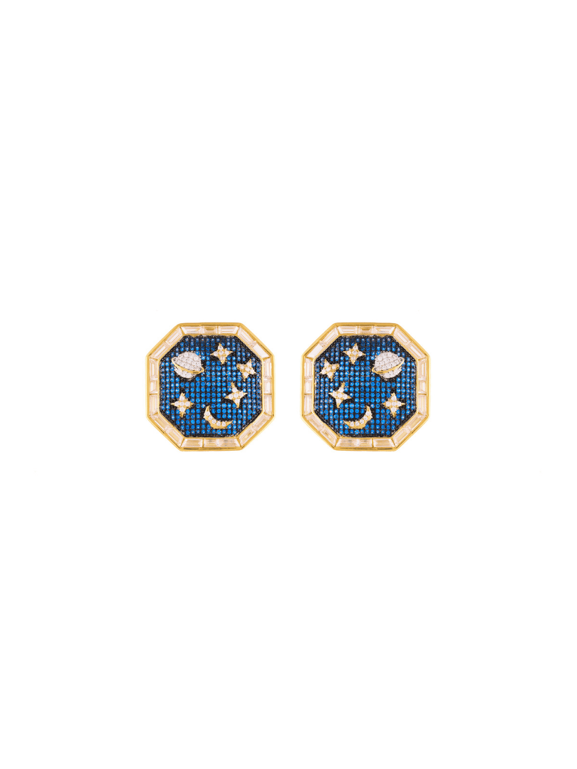 Los aretes perfectos para complementar tus looks con un toque de estilo muy moderno y celestial! Su diseño octagonal adornado con microcristales color zafiro y cristal crean un balance perfecto entre lo místico y lo sofisticado.
