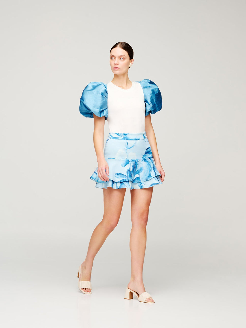 Con elegantes pliegues con volantes y un estampado floral azul, esta